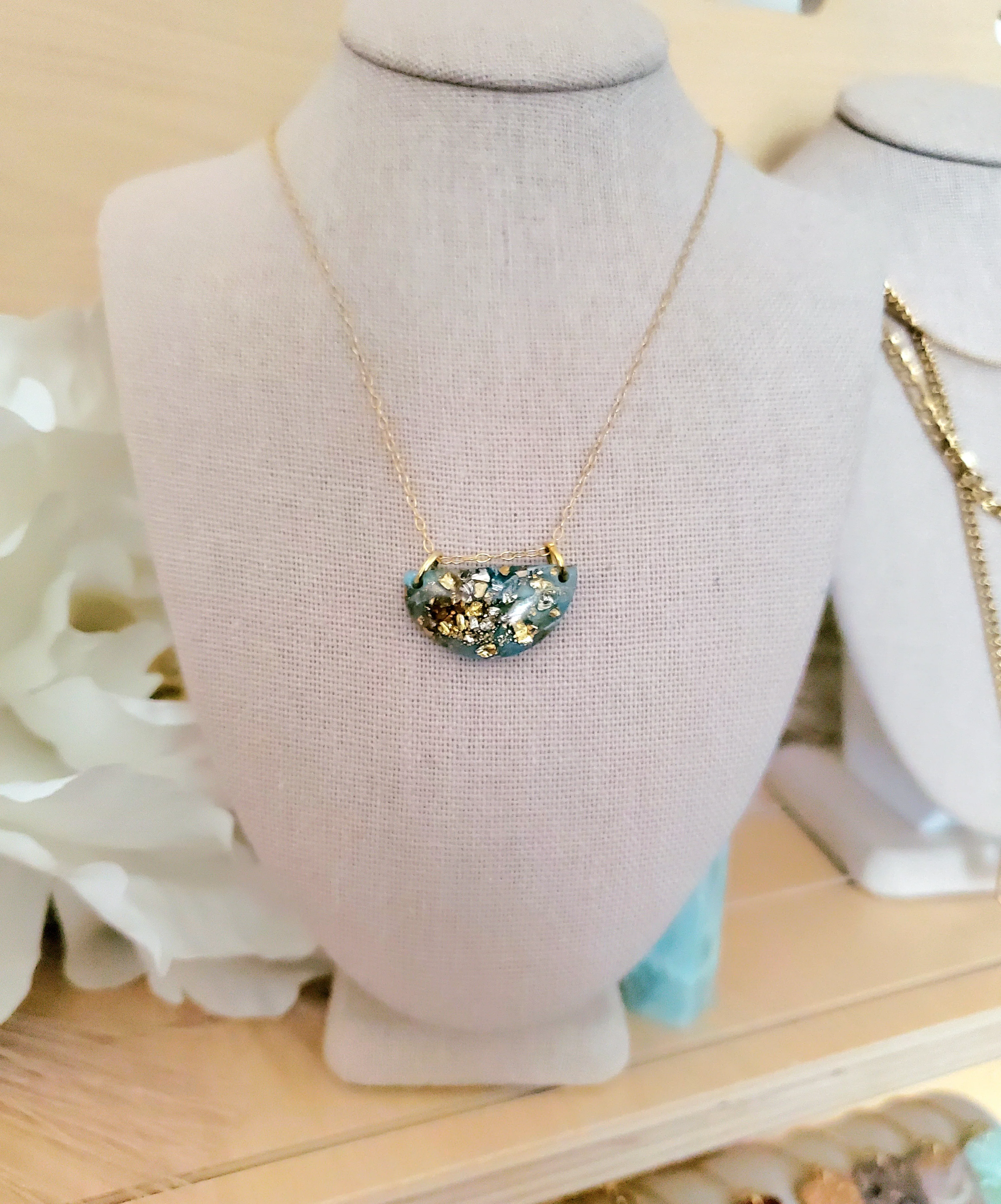 Introducing our exquisite Agate Inspired Mini Necklace. At the heart of this necklace lies a captivating pendant, handcrafted from polymer clay. Inspired by enchanting hues and gold found in natural agate, the pendant boasts a truly unique and striking appearance.