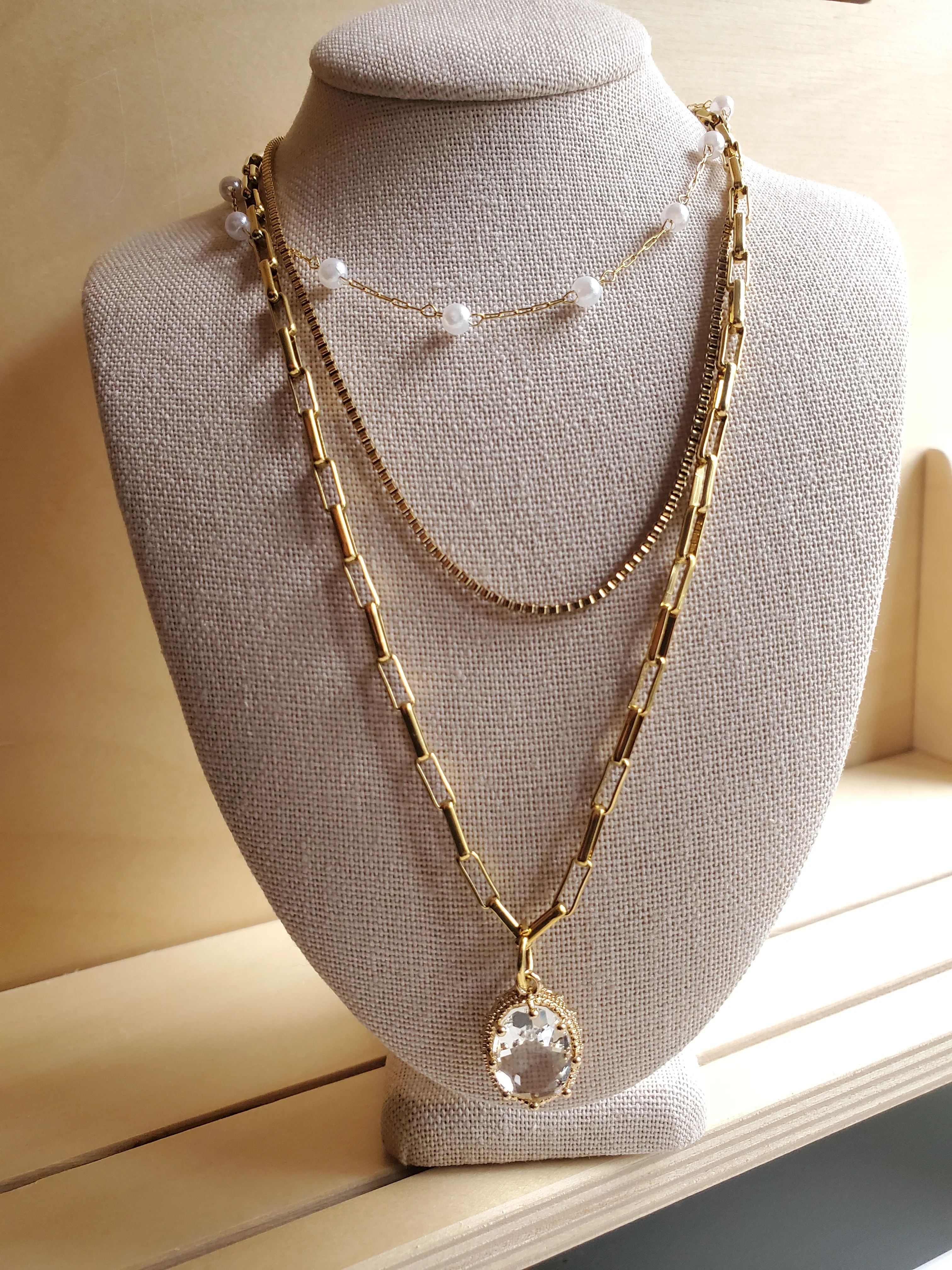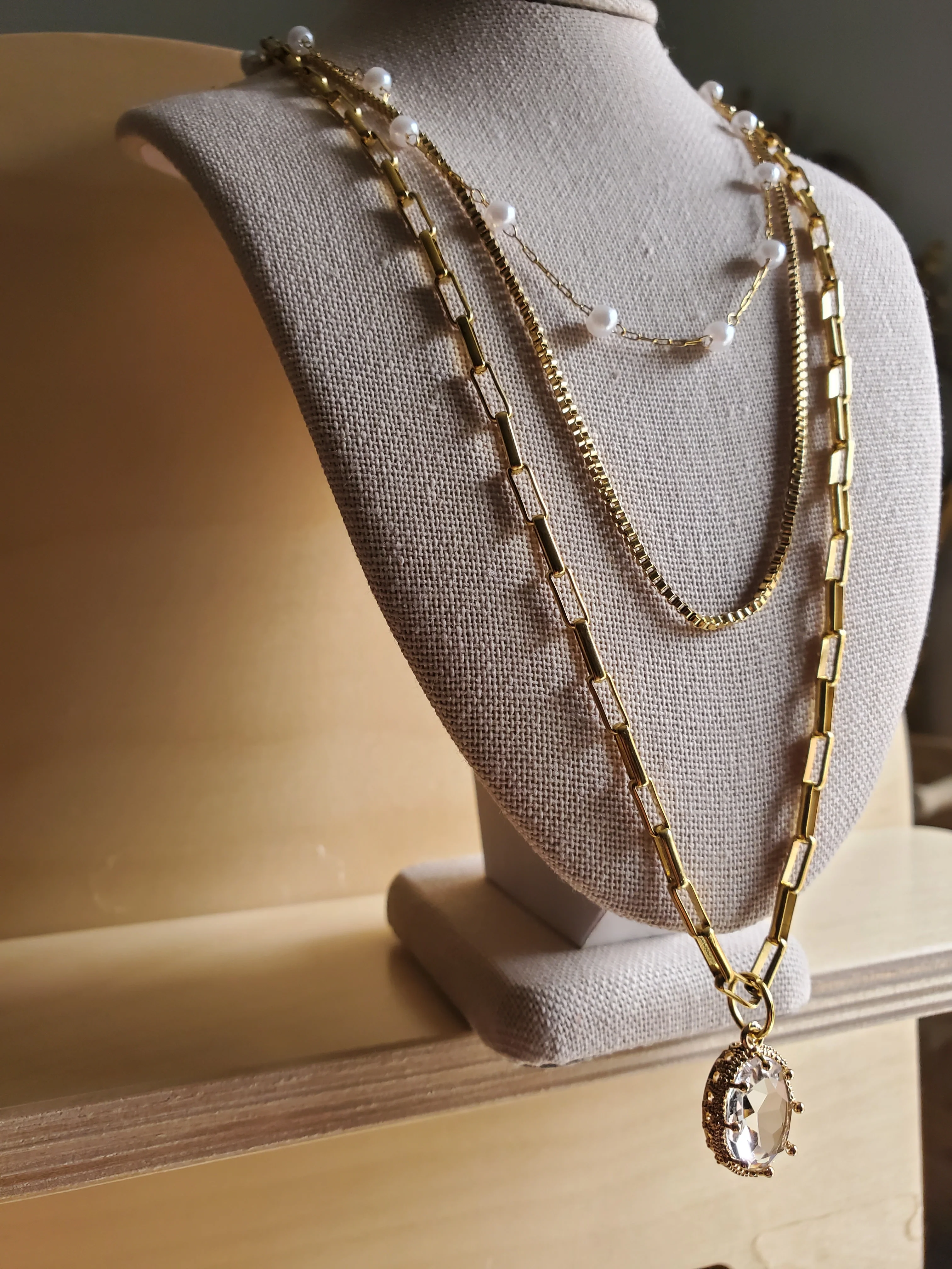 Featuring delicate layered gold chains and a stunning vintage glass charm, this necklace effortlessly adds a touch of elegance to any outfit. Perfect for those who appreciate timeless beauty and want to make a subtle statement, it's a must-have accessory for any modern-day fashionista.