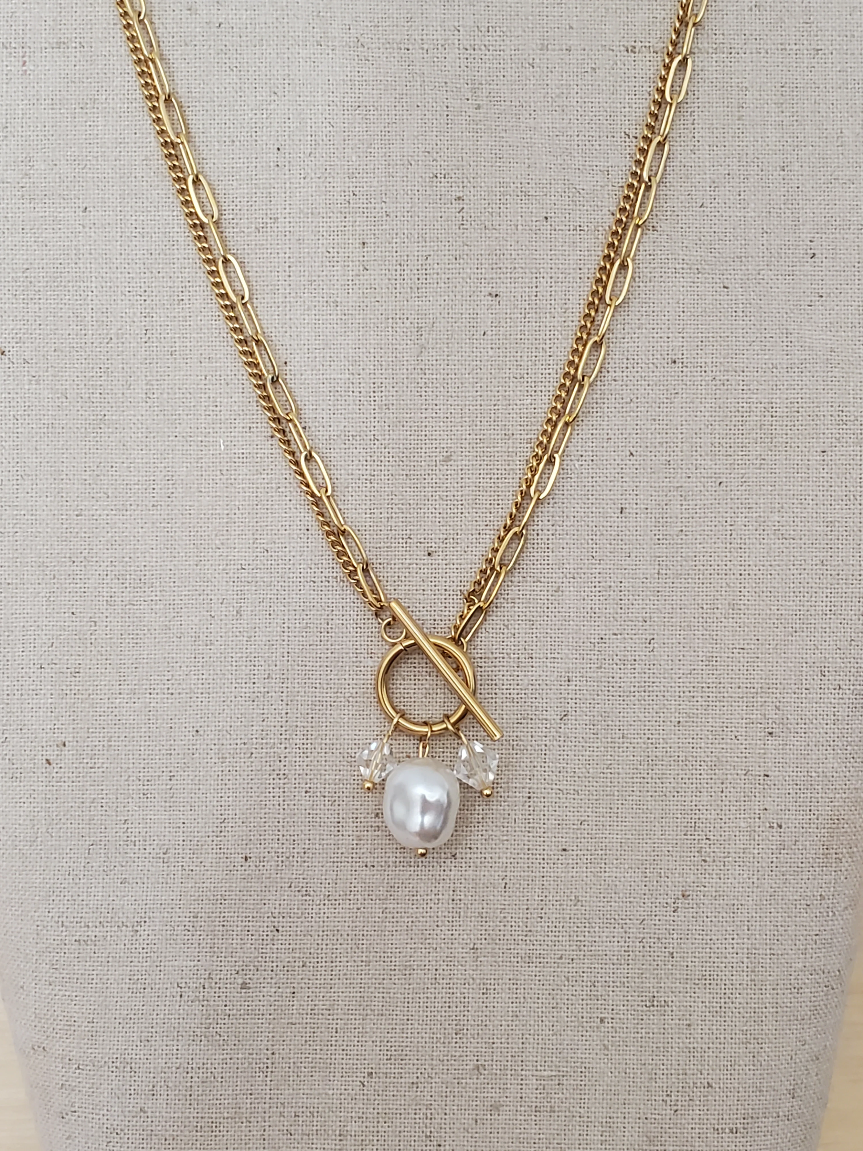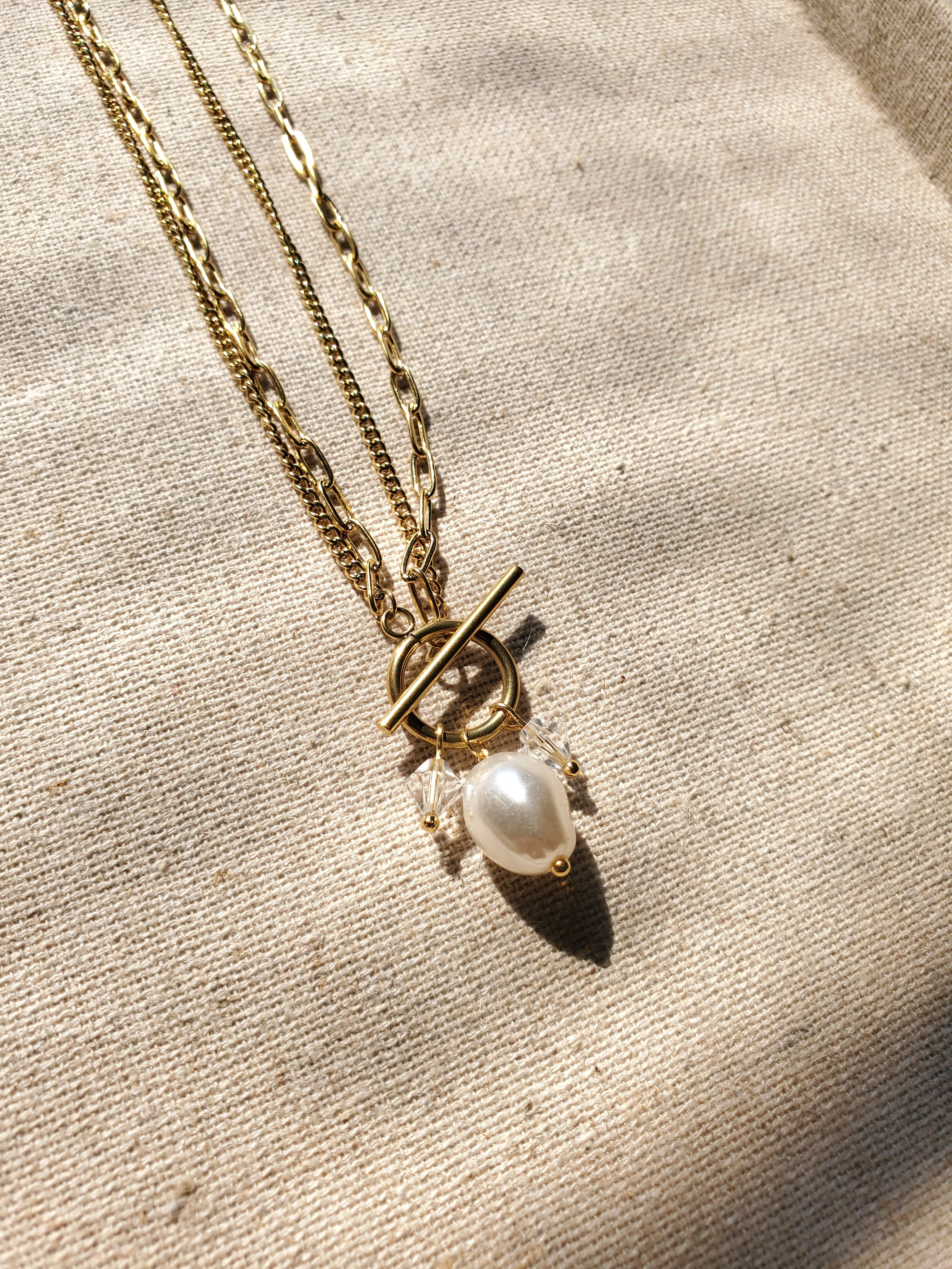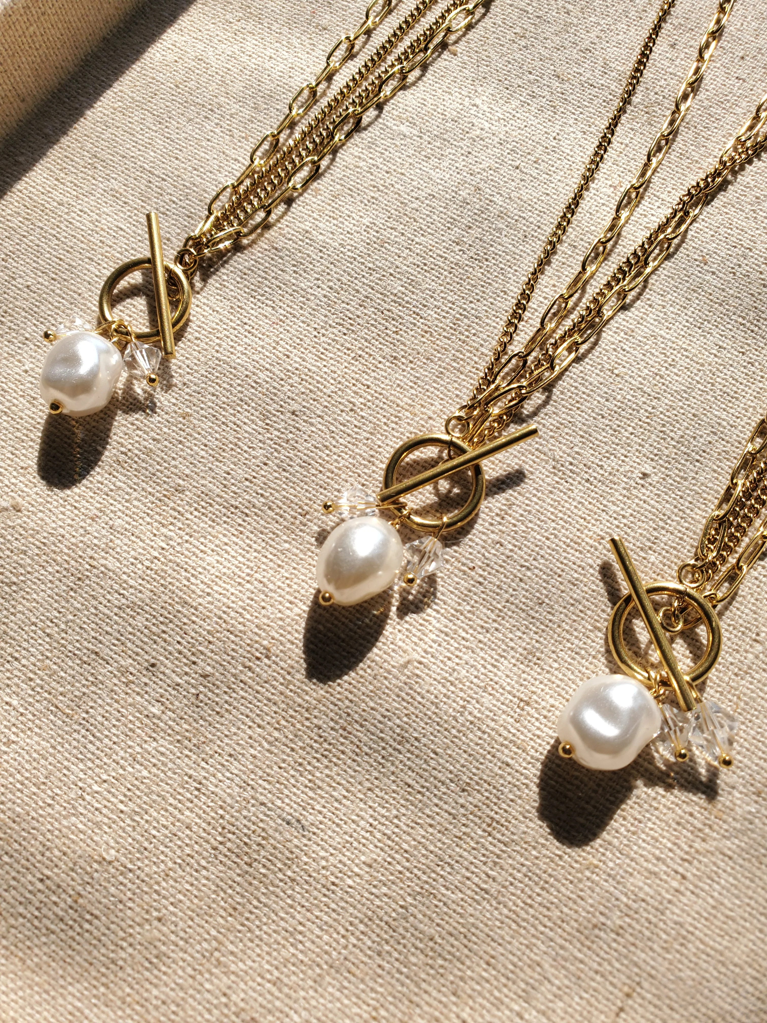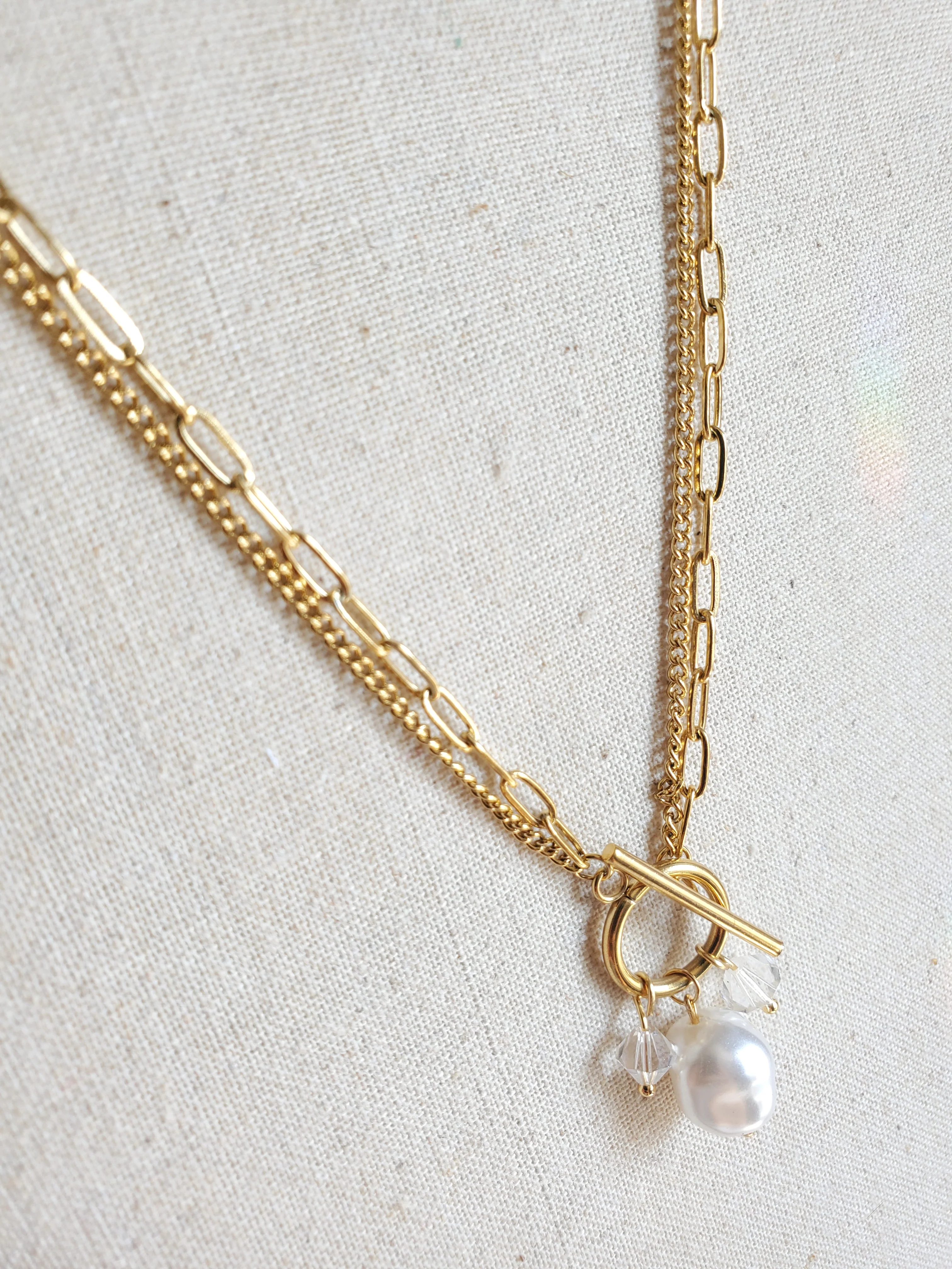 Welcome to our GEMMA Layered Choker Necklace. This timeless choker is adorned with small crystals and a baroque pearl that add a beautiful simplicity, and elegant gold chains that cascade down in layers. Our GEMMA Layered Choker Necklace is a treasured piece meant to add sparkle to your daily style.