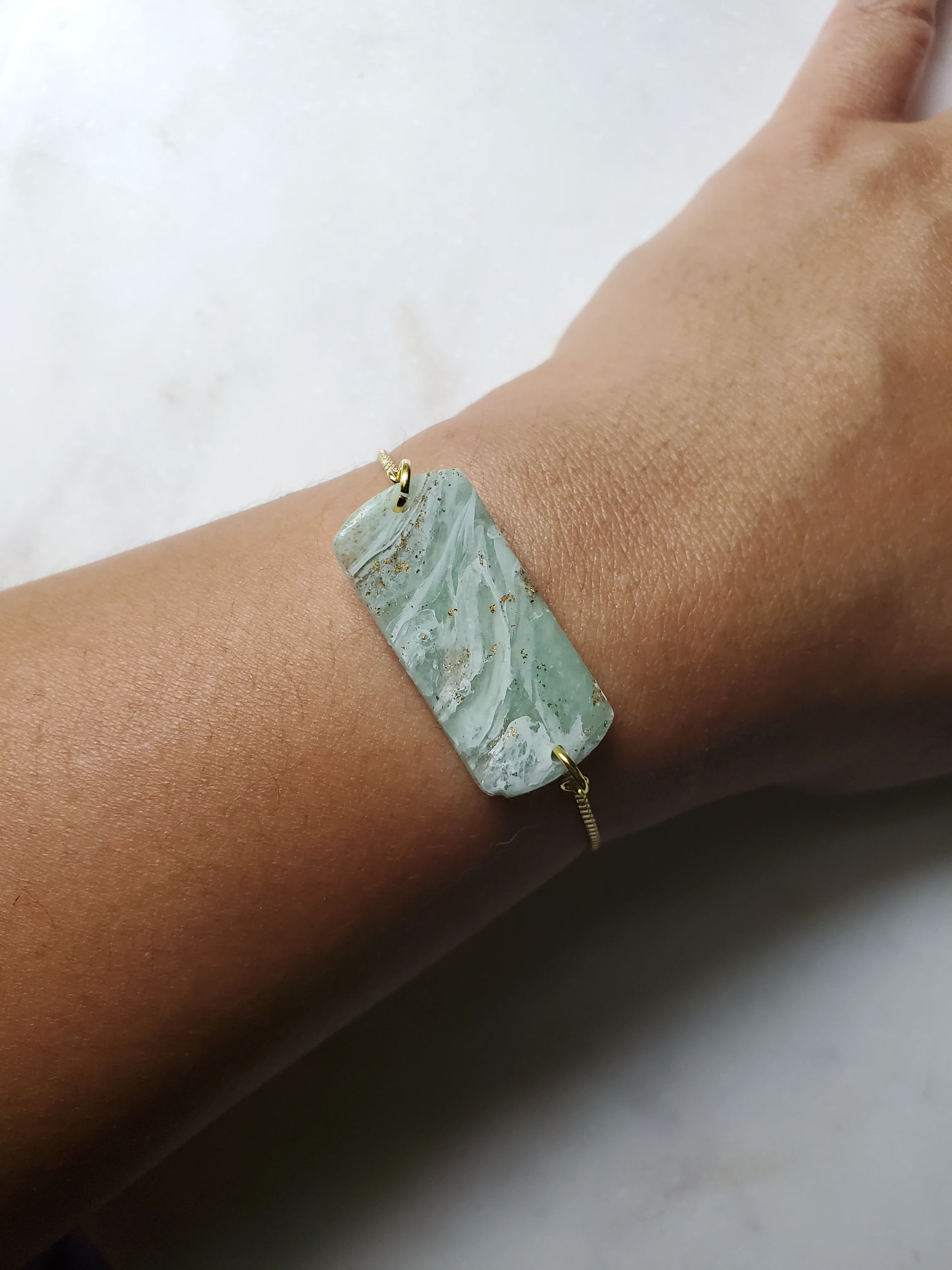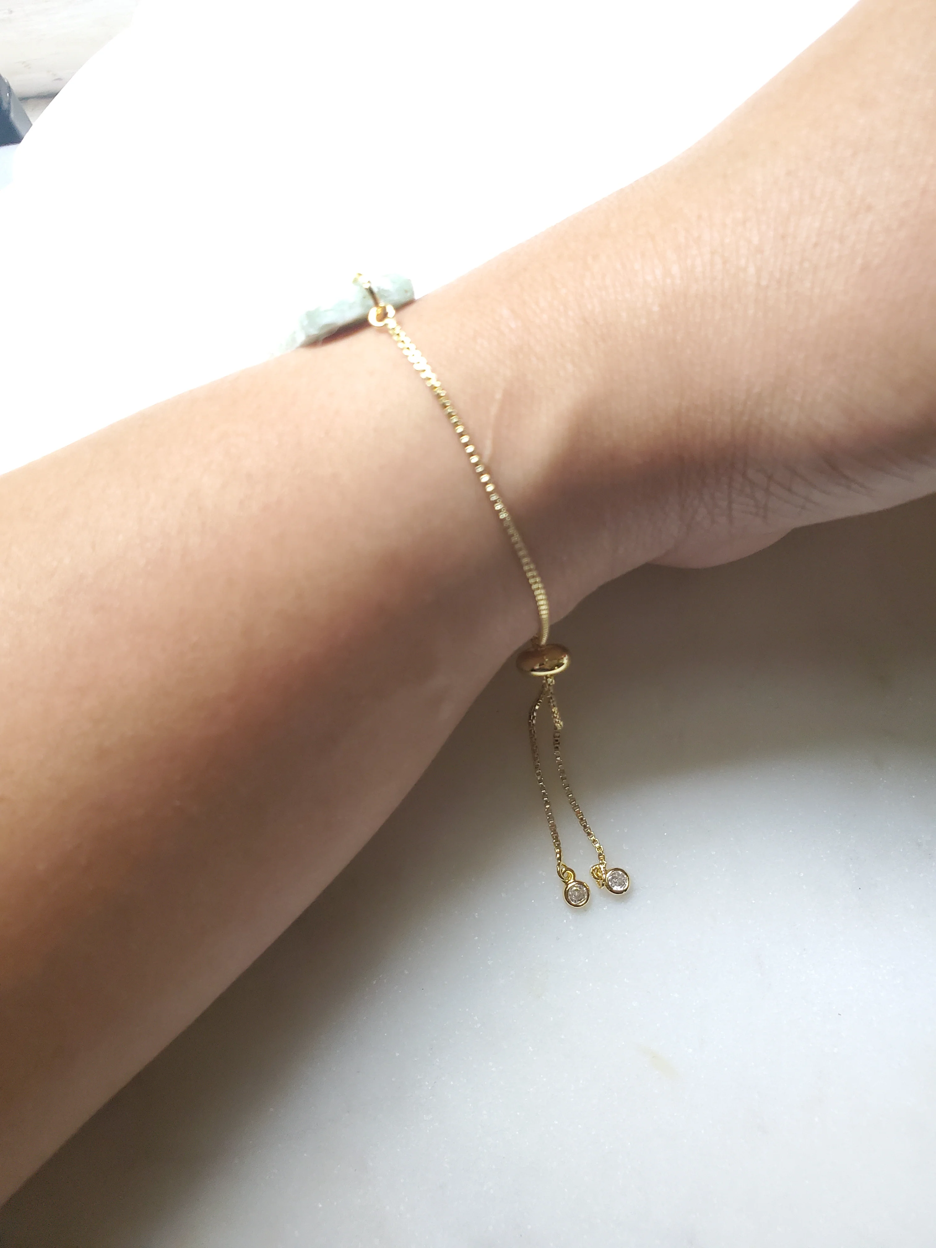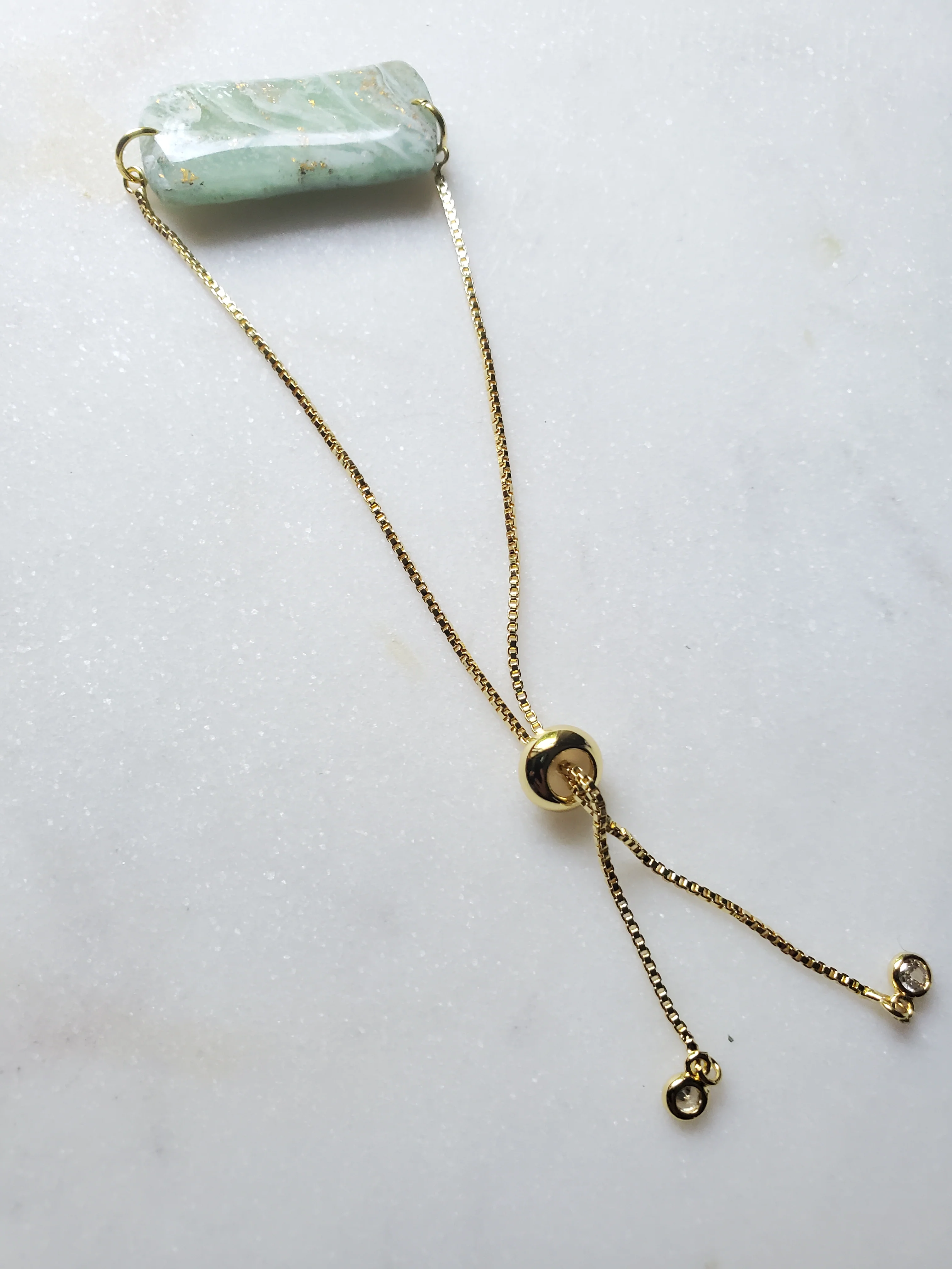 Elevate your style with our exquisite Jade Inspired Clay Bracelet, a true work of art. This bracelet features a stunning handmade clay pendant adorned with dazzling rhinestones at each end, suspended from an elegant 18K gold plated chain. Its adjustable slider ensures a perfect fit, making it the ultimate statement piece for any occasion.