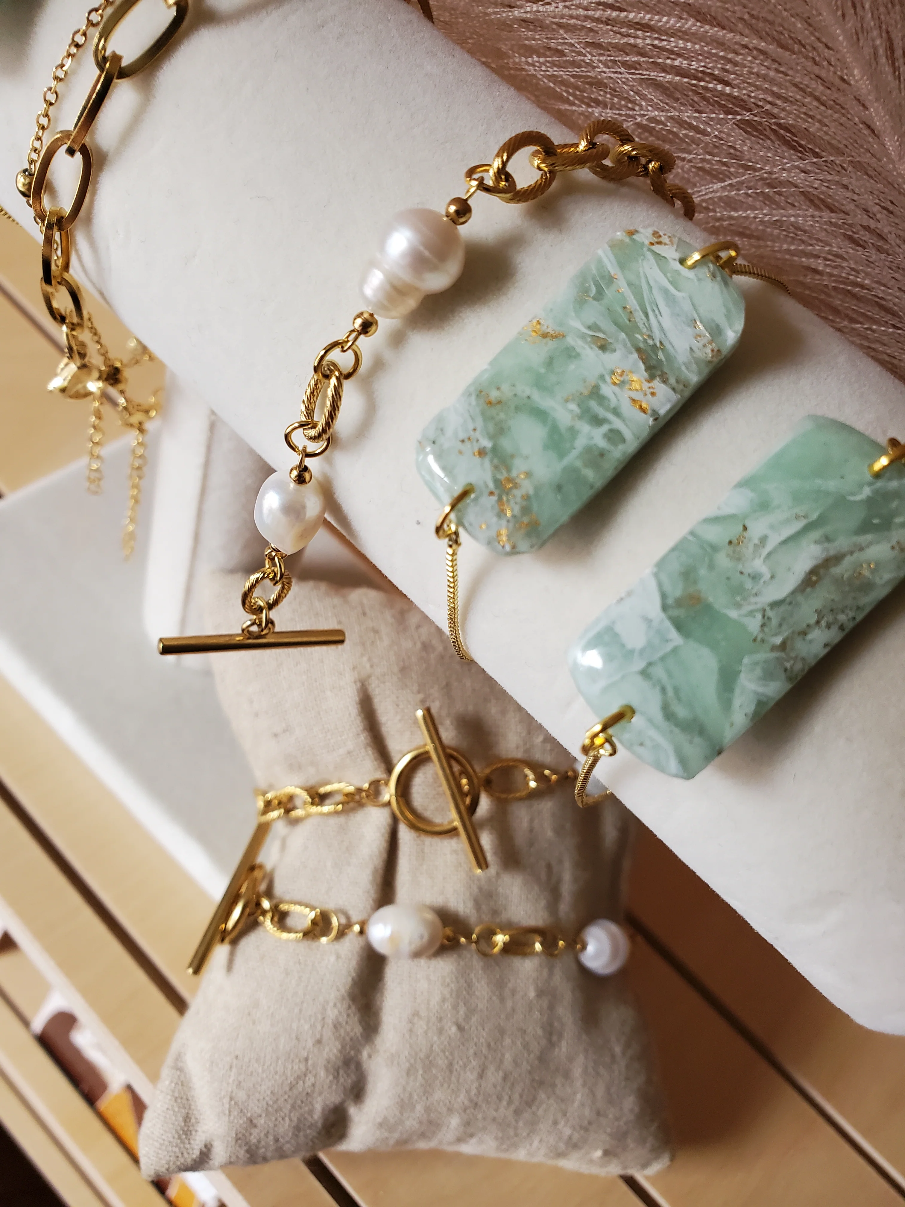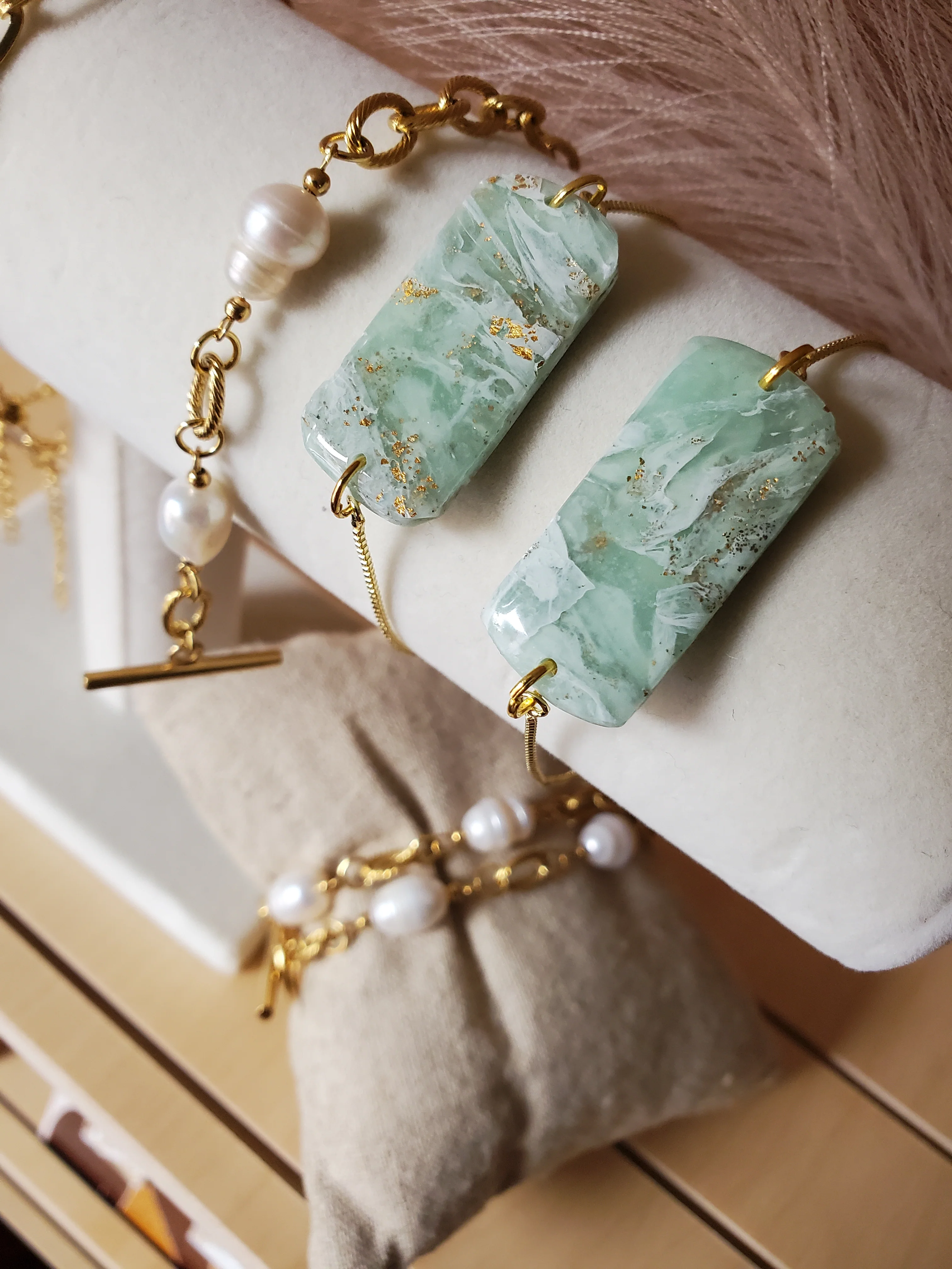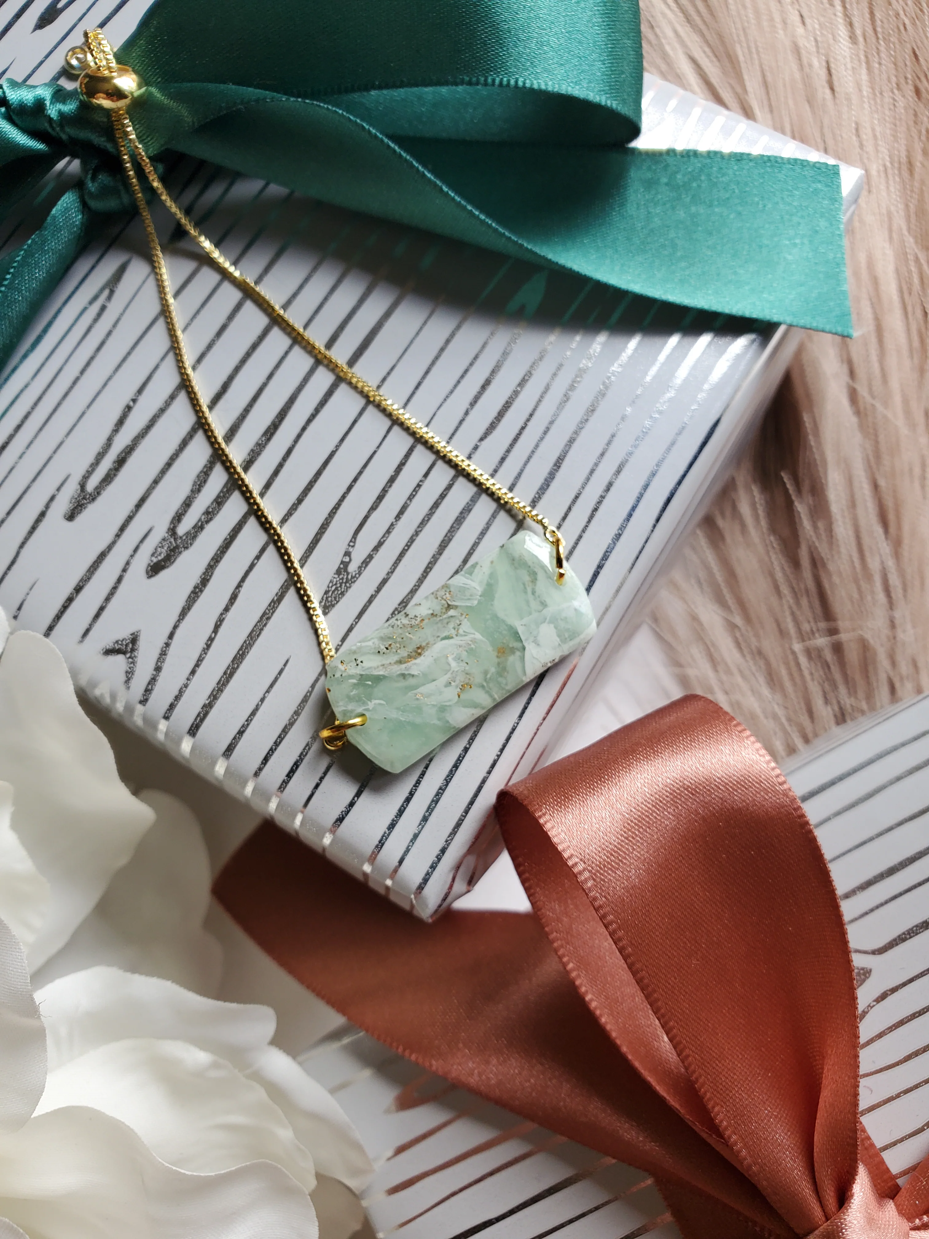 Elevate your style with our exquisite Jade Inspired Clay Bracelet, a true work of art. This bracelet features a stunning handmade clay pendant adorned with dazzling rhinestones at each end, suspended from an elegant 18K gold plated chain. Its adjustable slider ensures a perfect fit, making it the ultimate statement piece for any occasion.