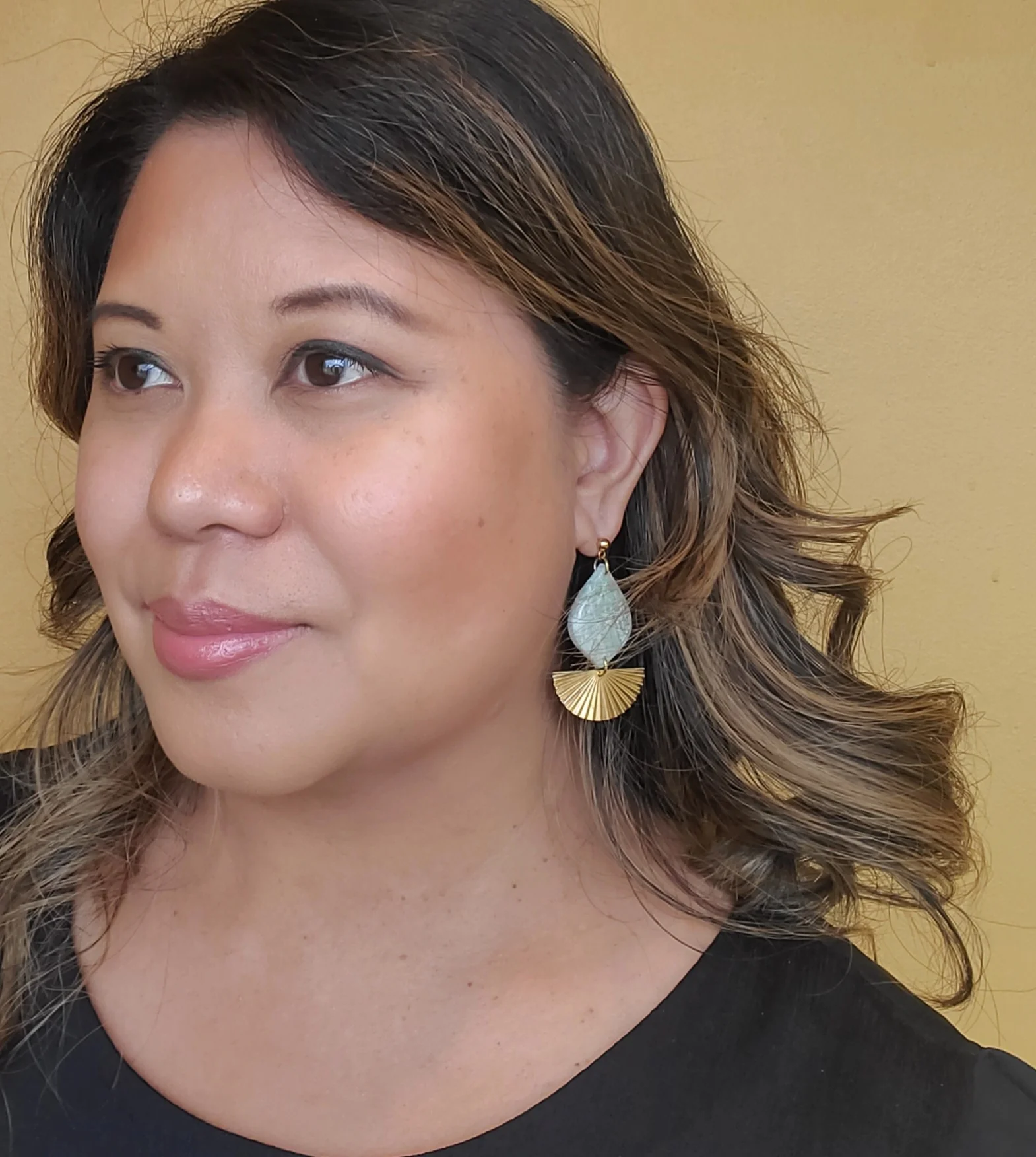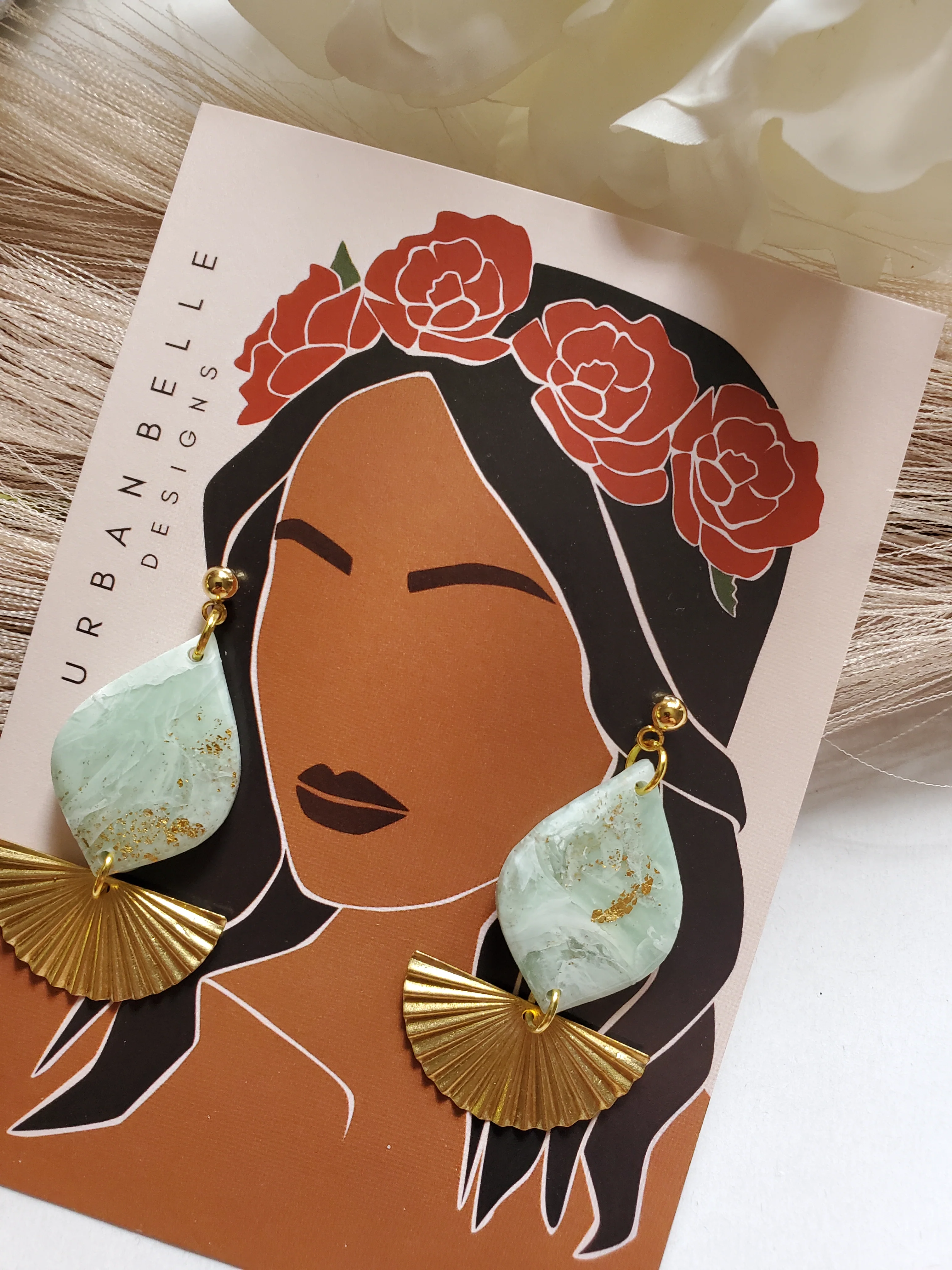 These gorgeous Lucille Jade Inspired Fan Statement Earrings exude classic yet chic vibes. Beautifully-handcrafted from gold plated brass, each earring features marbled gold and light jade hues. Perfect for those seeking to make a statement, these earrings will add a touch of luxury to any ensemble.