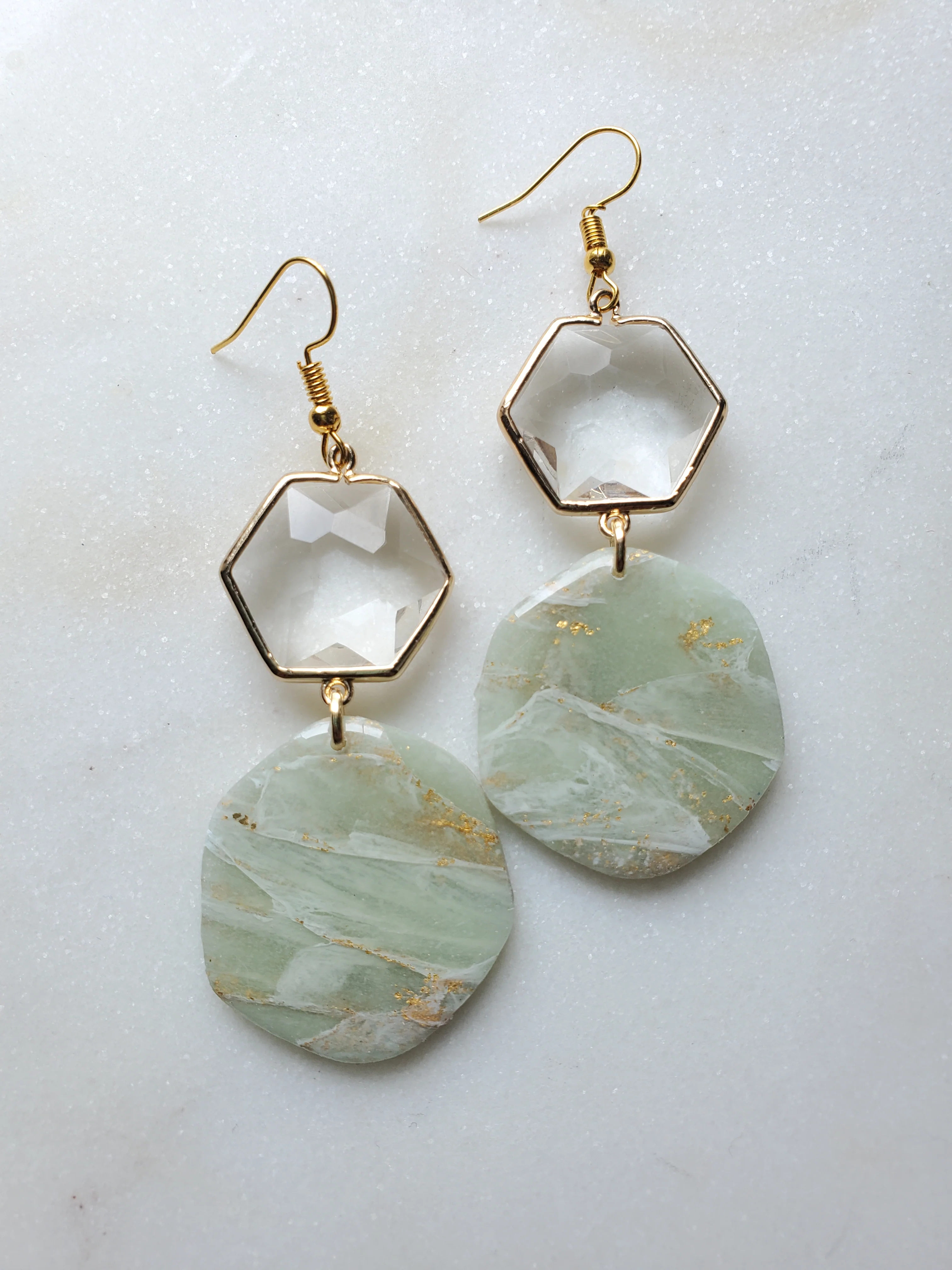 These gorgeous Jade Inspired Glass Statement Earrings exude classic yet chic vibes. Beautifully-handcrafted from gold plated brass, each earring features a sparkling Gingko and light jade hues. Perfect for those seeking to make a statement, these earrings will add a touch of luxury to any ensemble.