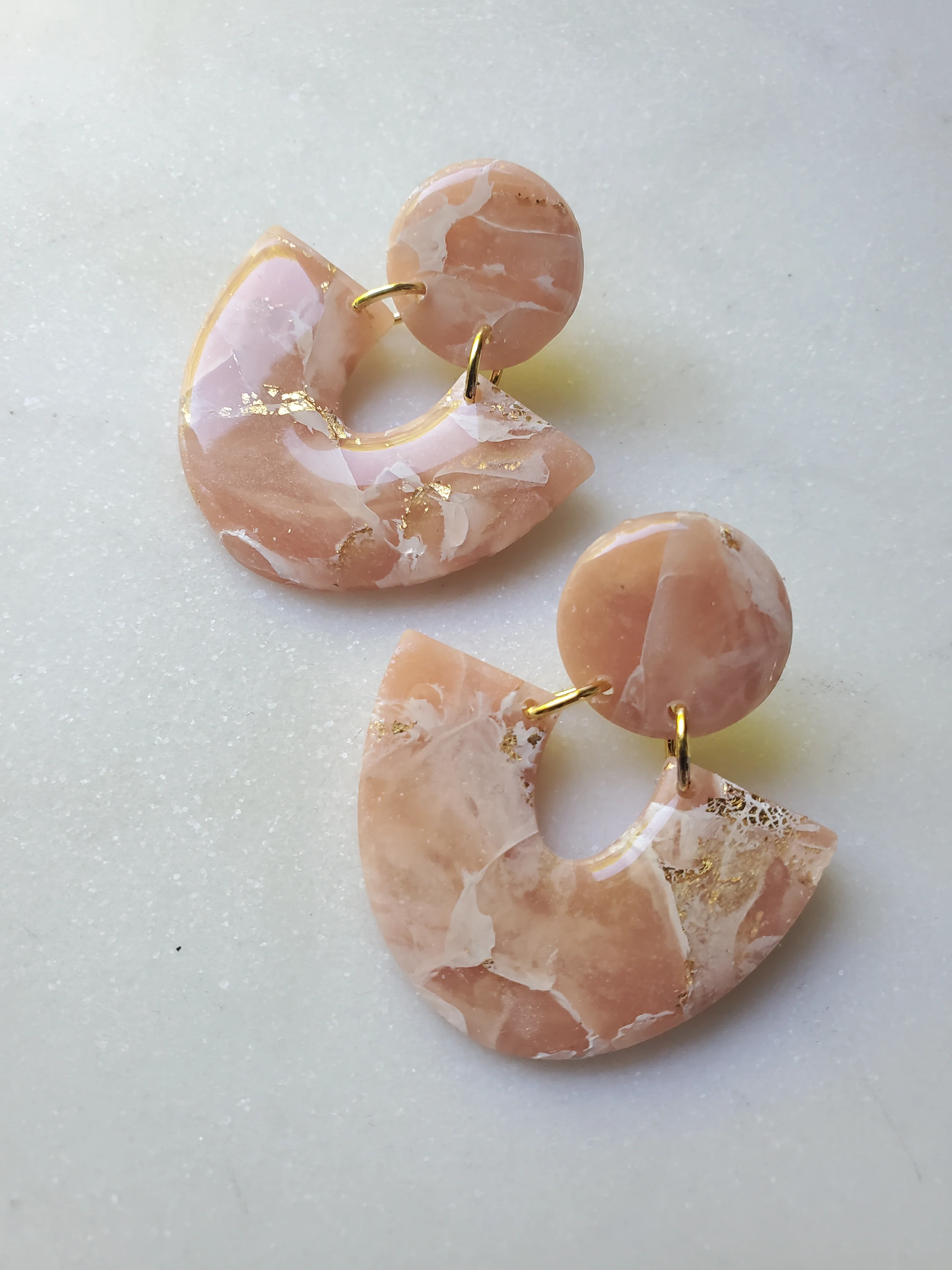 Introducing the Lola Statement Earrings, a must-have in any modern fashionista's jewelry box. These glam earrings feature stunning marble peach swirls and gold accents that are sure to turn heads. Each pair is handcrafted and made with love + clay, by yours truly! No pair will be alike and are truly unique.