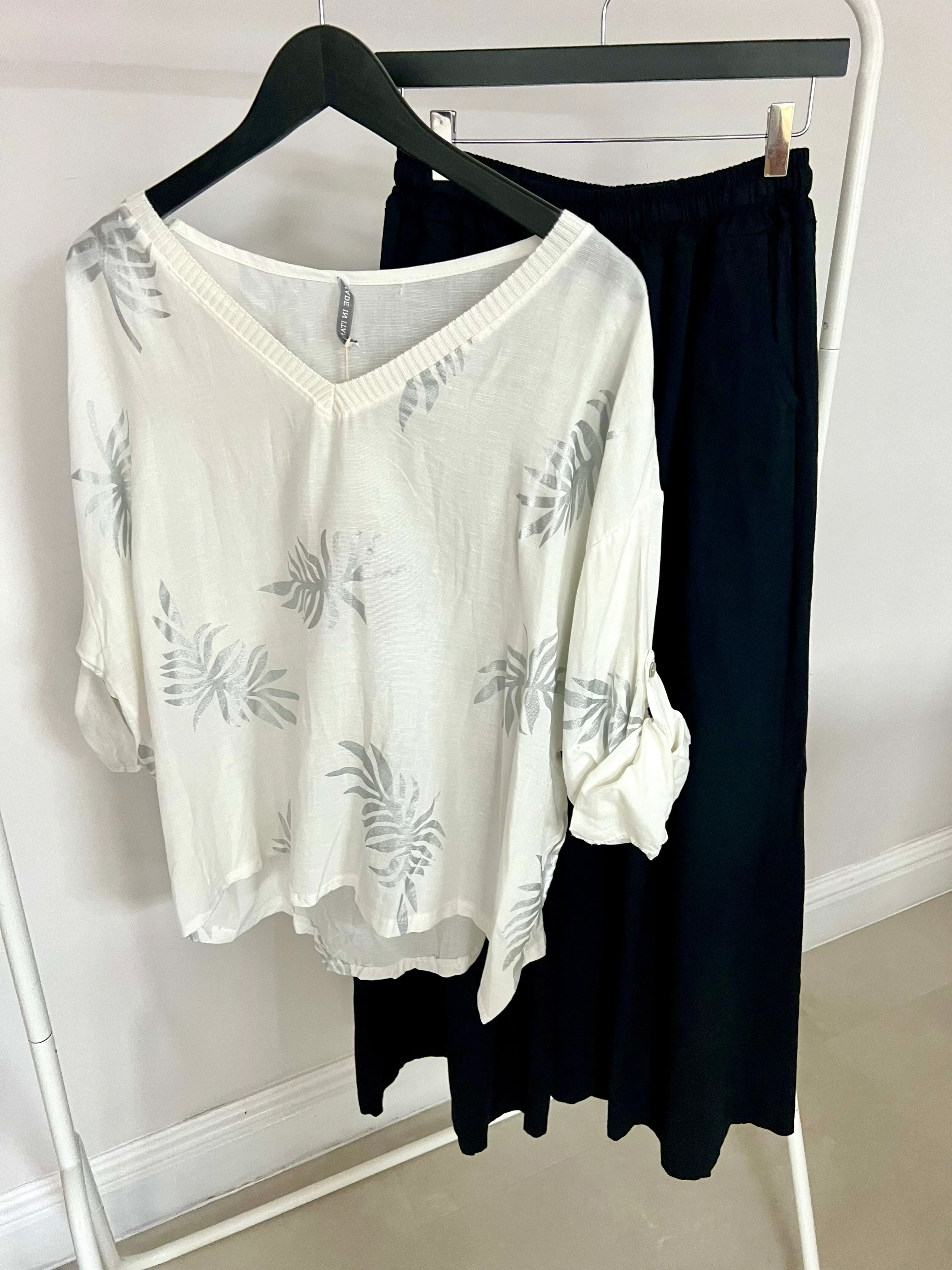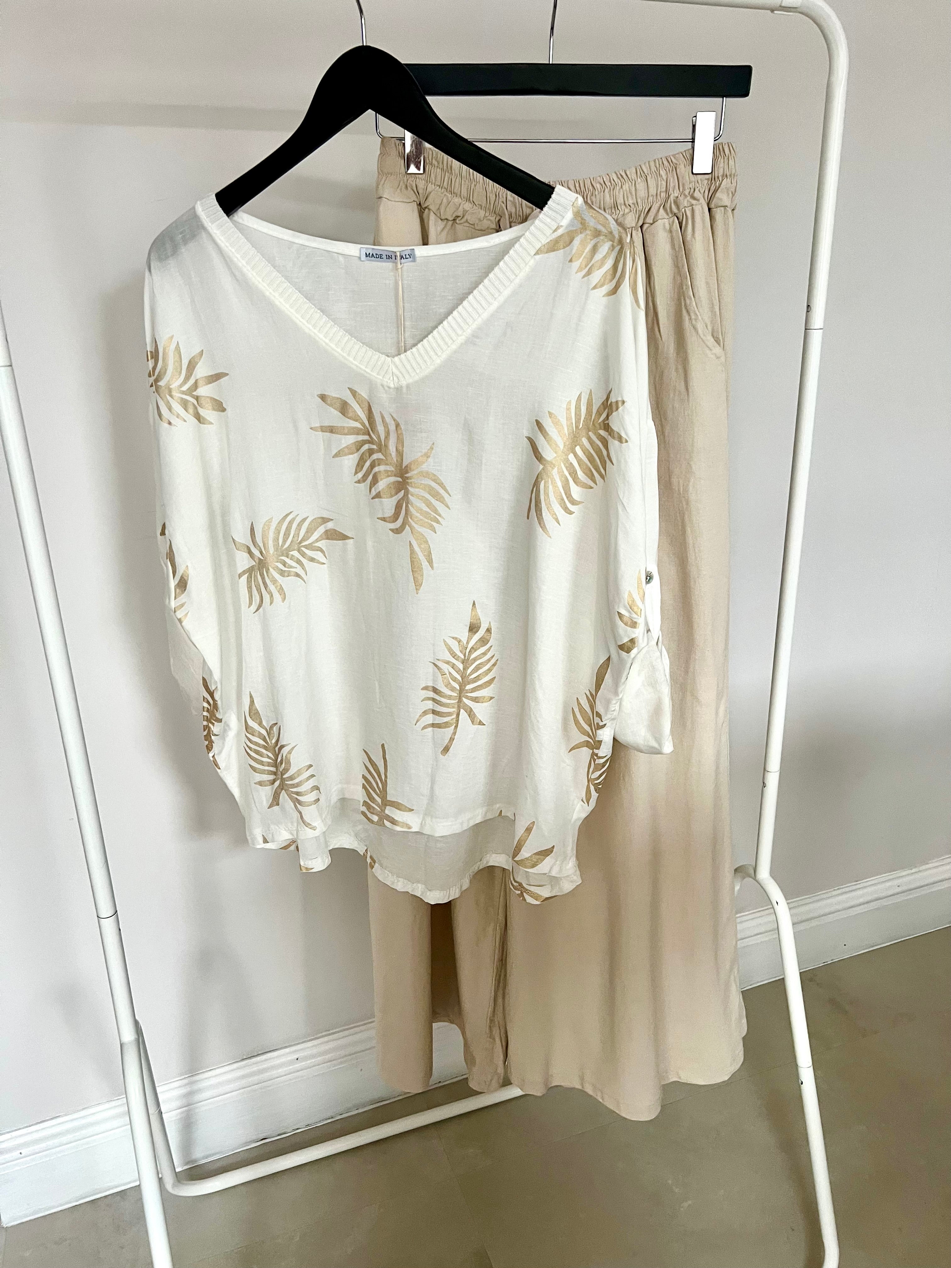 Expertly crafted in Italy, our Leaf Print Top features a subtle metallic palm leaf print that adds a touch of glamour. The button-back sleeves provide a sophisticated detail, making this top perfect for any occasion. Elevate your wardrobe with this unique piece.