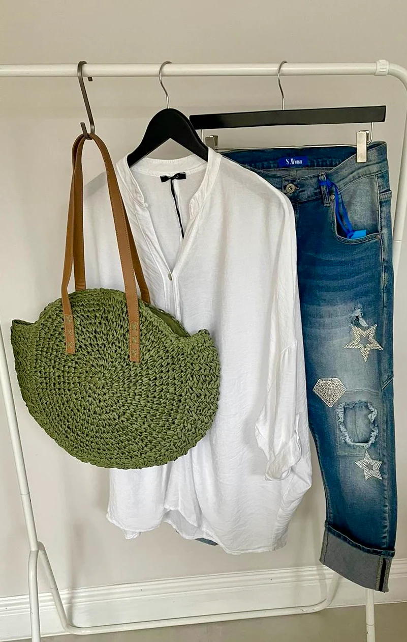 The Ruched Front Shirt is a versatile piece that pairs perfectly with our skinny magic trousers or denim shorts for a stylish summer look.