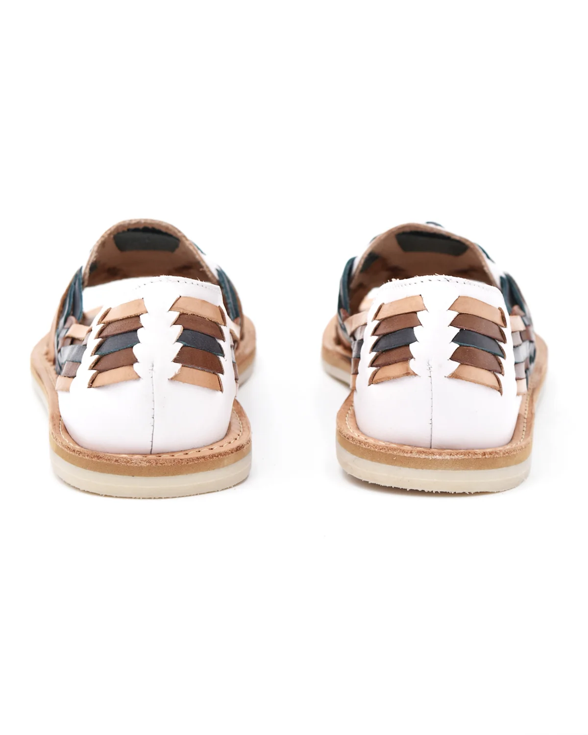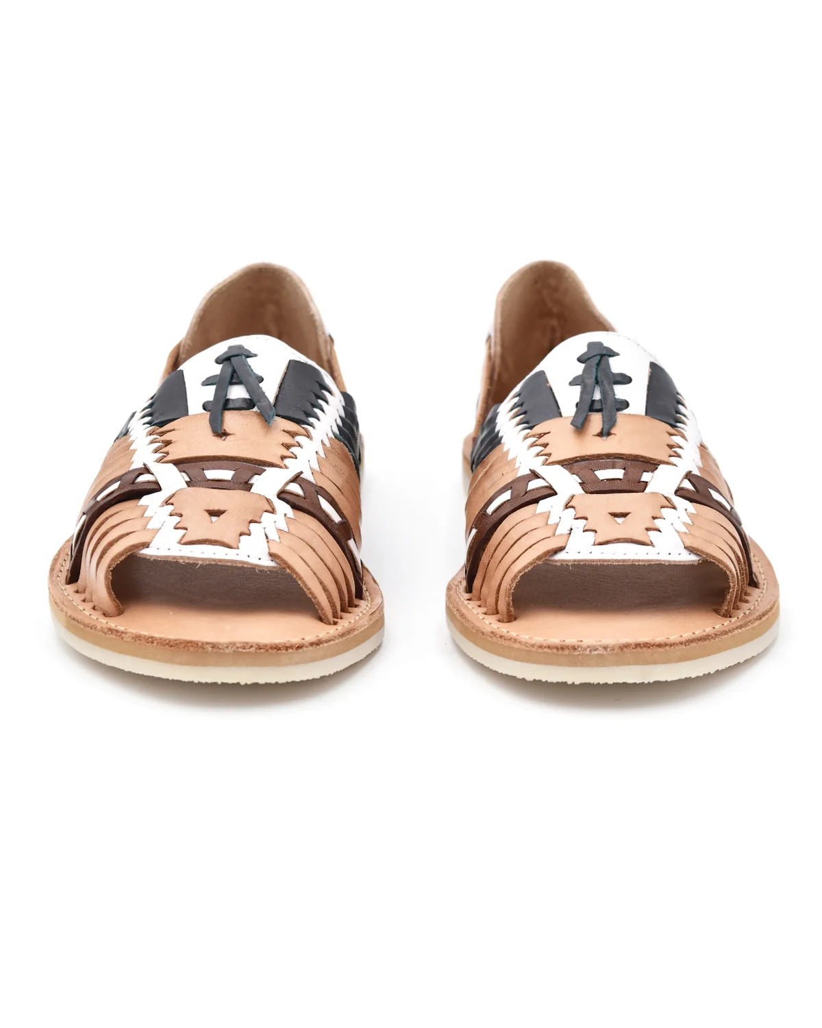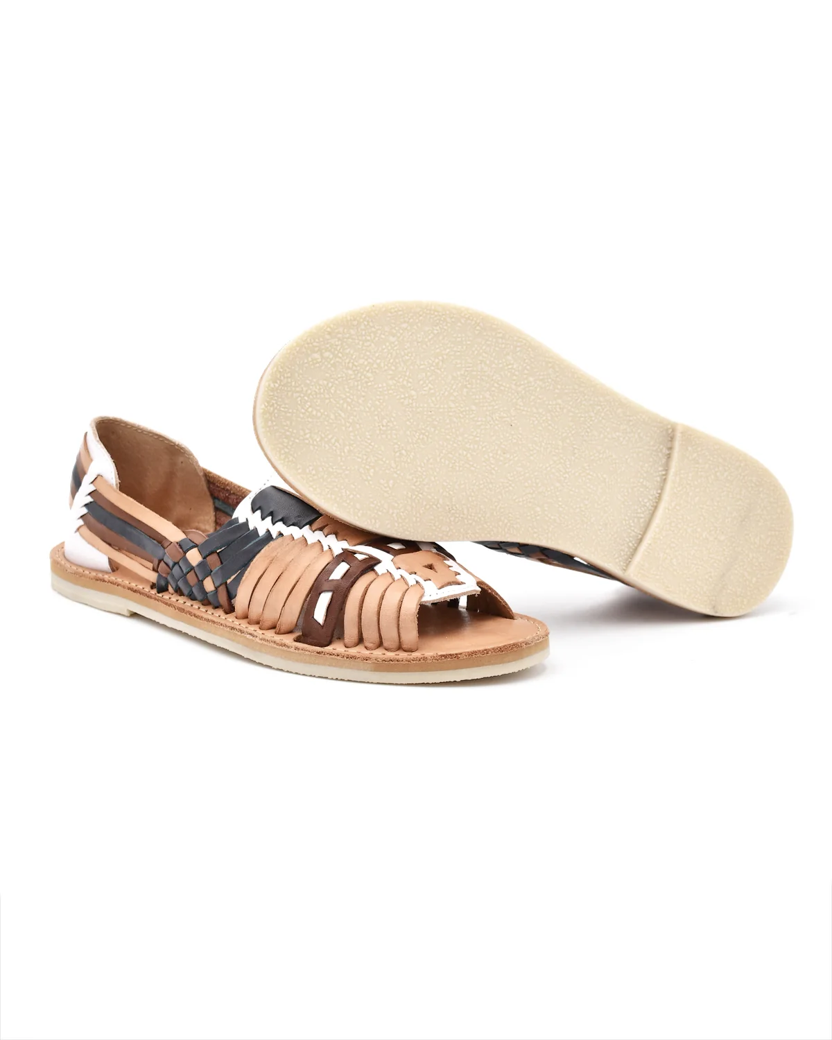 Chamula offers refined and endlessly wearable sandal silhouettes. The Uxmal sandal features moderate foot coverage with a covered heel and open toe. Along with the striking multi-color weave, the Uxmal features a decorative leather tie. The "naked" finish of the leather results in a gorgeous patina that develops with time and wear. The sole is made from a light weight crepe that is great for comfort and durability.