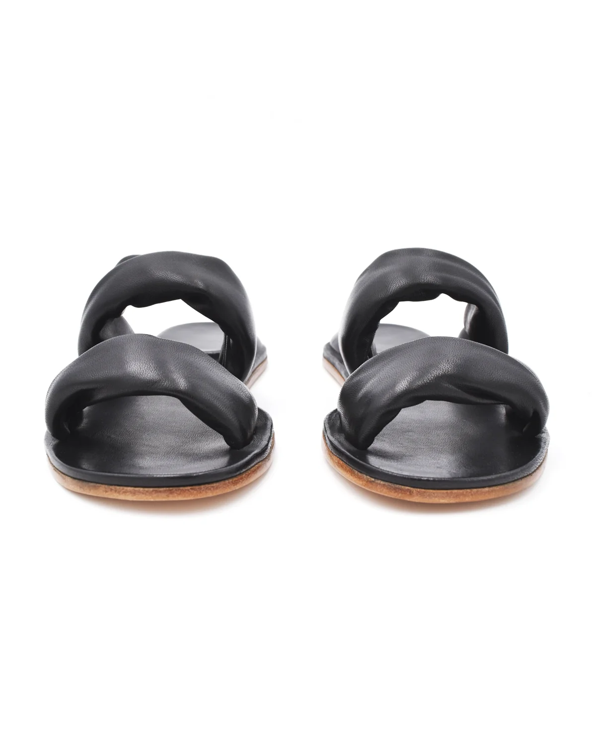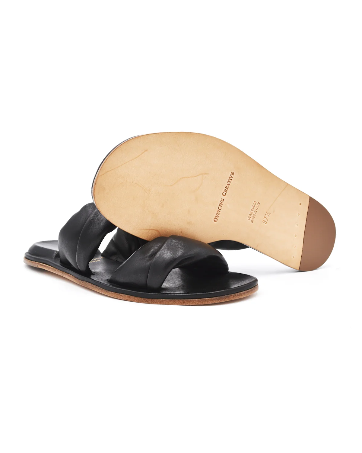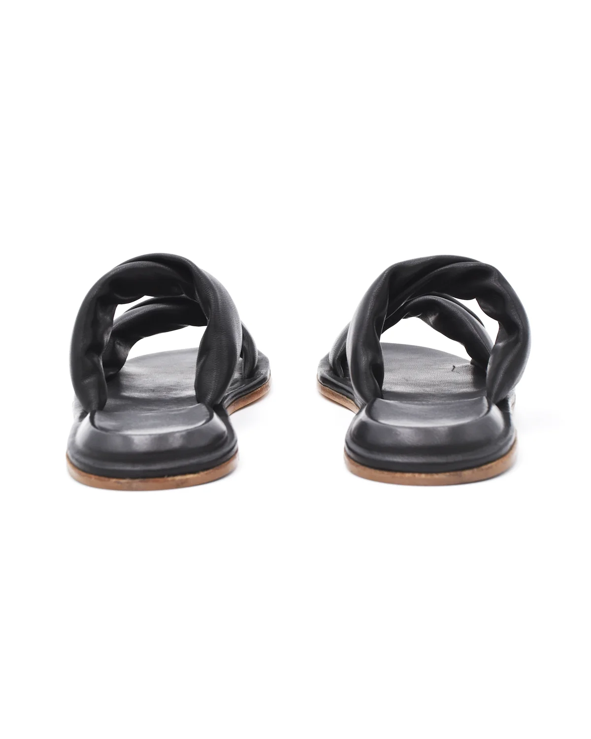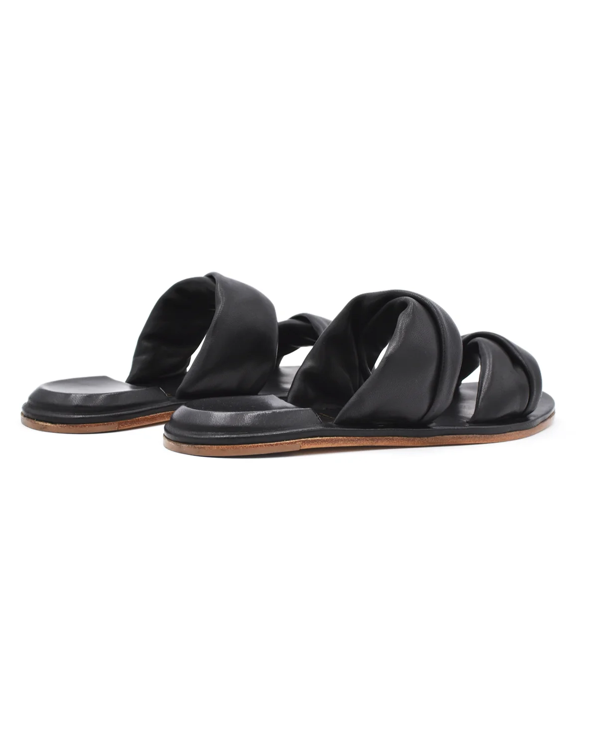 The Cybille is a minimal two strap black sandal with a little extra. The straps are constructed from intertwined padded leather, which securely hold the foot with the highest level of comfort. The heel is held in place by a minimally designed heel cup that molds to the foot shape with wear. Made in Italy.