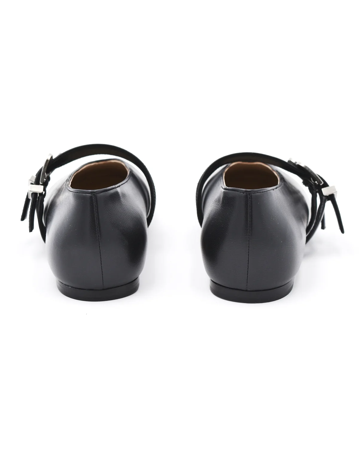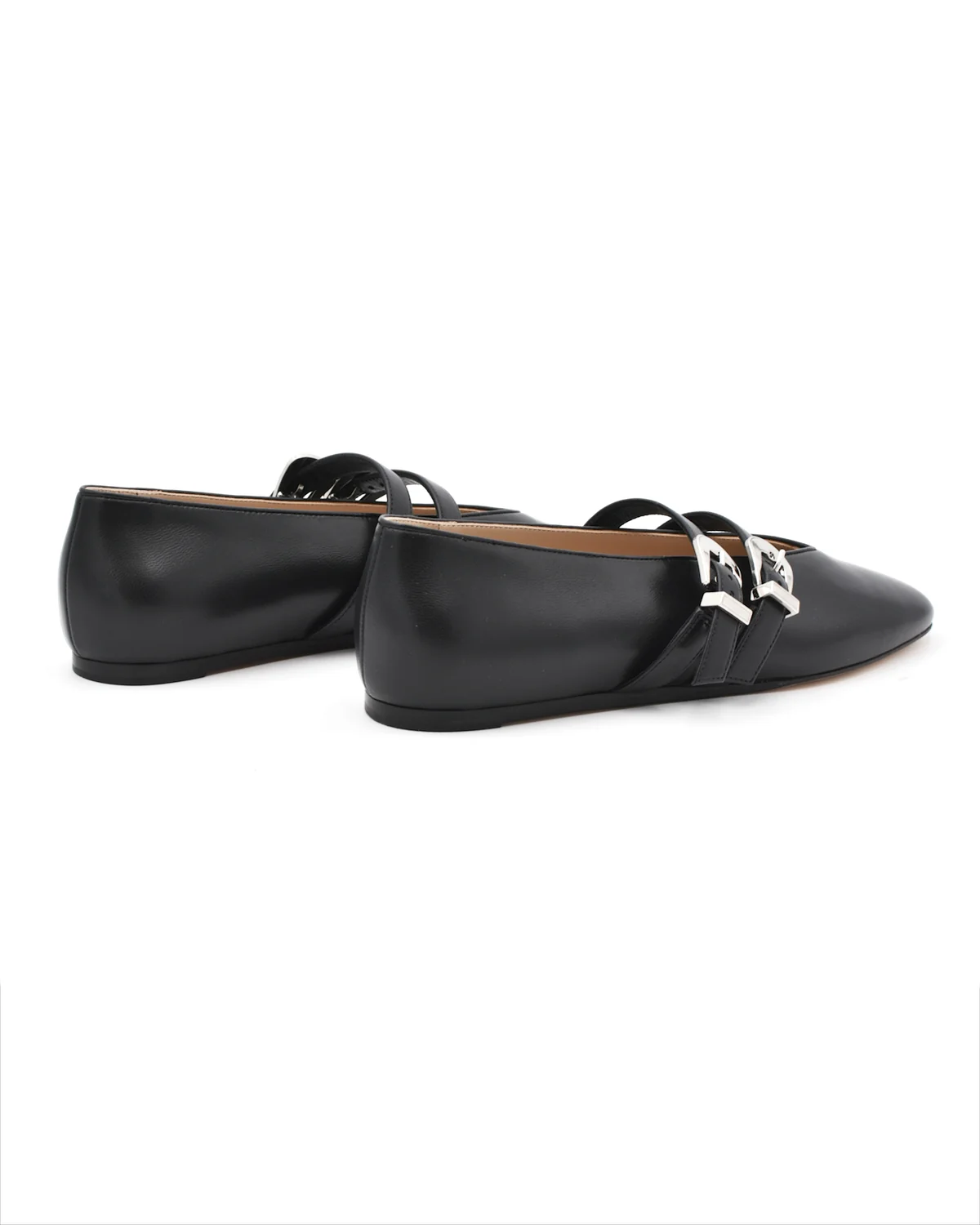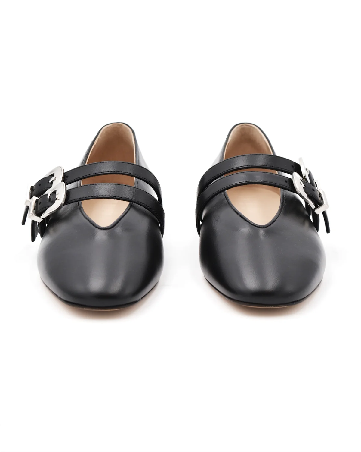 The Claudia flat from Le Monde Beryl uses their essential Luna flat slipper as a base, adding two silver buckle straps of the top of the foot. The two straps connect at the outsole and wrap around the exterior of the shoe, giving a unique, chunkier look and feel. The upper is cut from a soft calf leather with a cushioned calf leather insole and leather piping. 8mm heel. Made in Italy.
