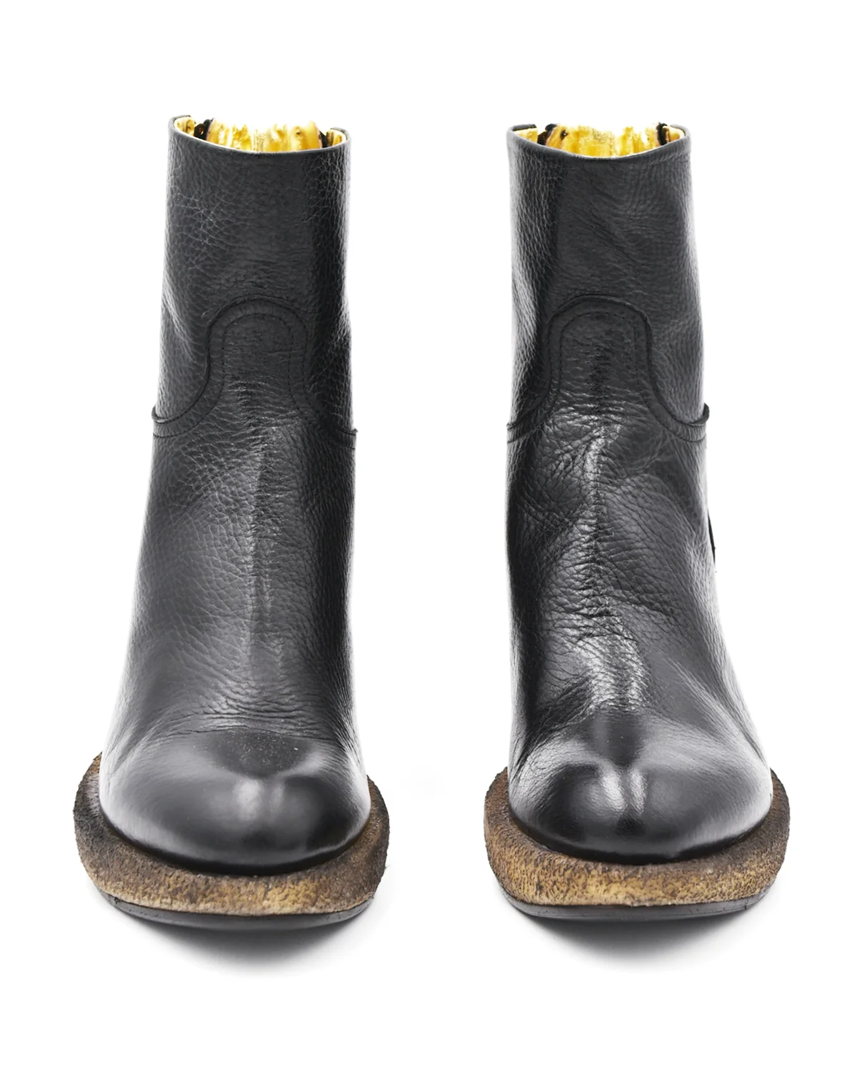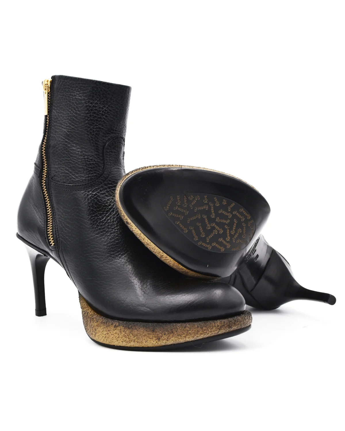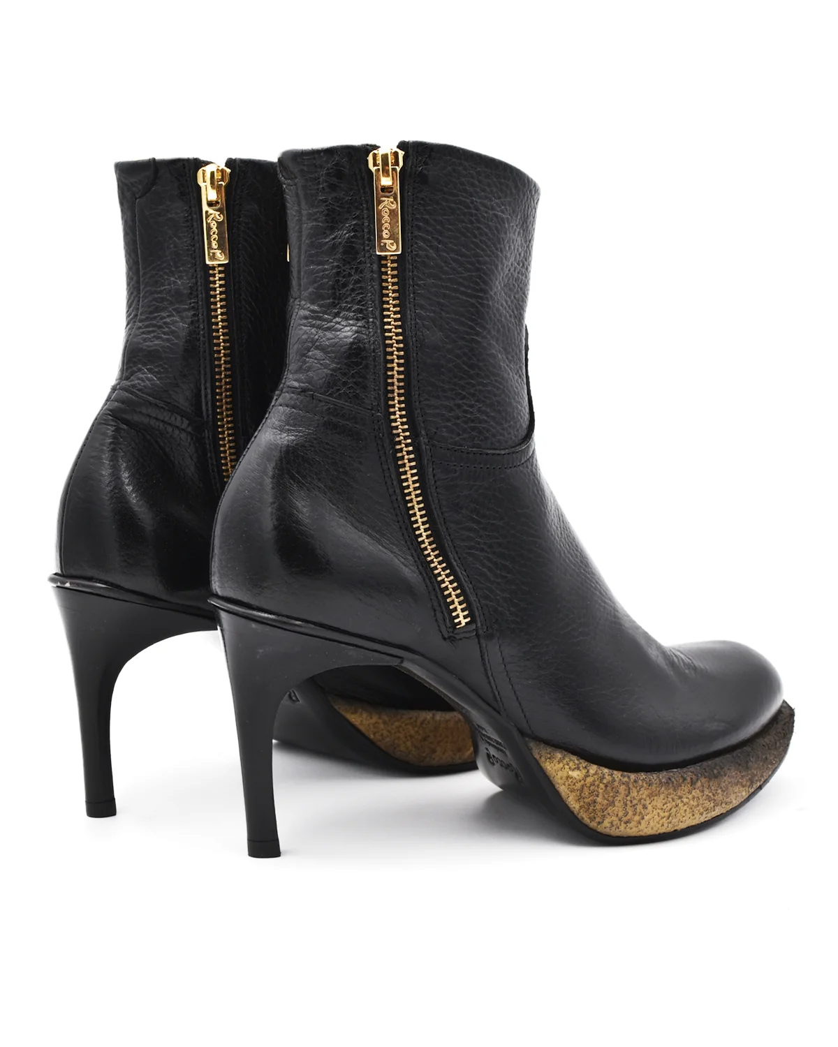 Prepare for your outfit to reach new heights with these stiletto boots from Rocco P. The contrasted color and texture of the base of the shoe, a "Rocco P" engraved zipper on either side, and a flashy gold interior elevate the shoe even further. No need to fear the 3.5" heel with the support of a sturdy front platform.