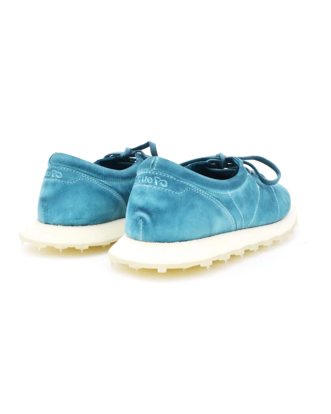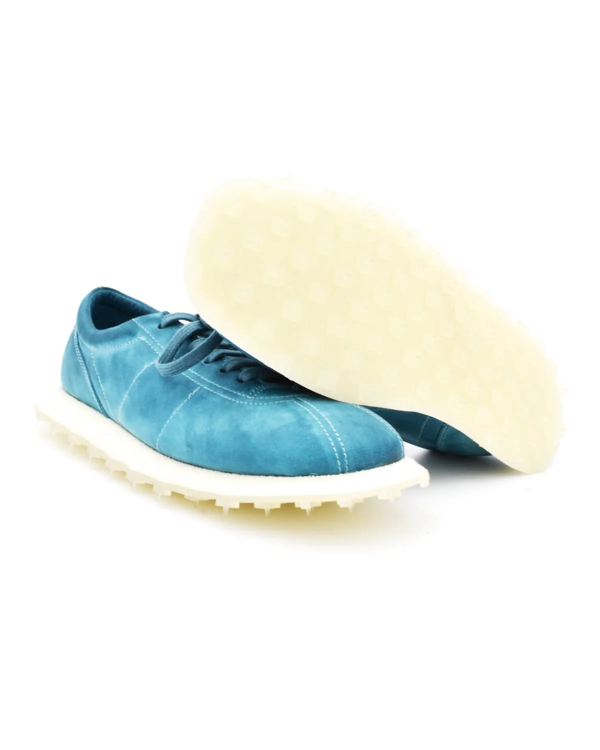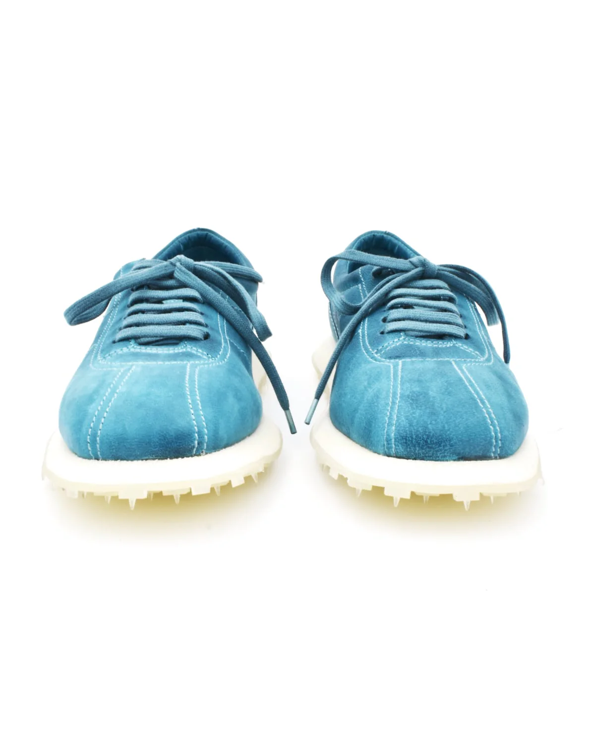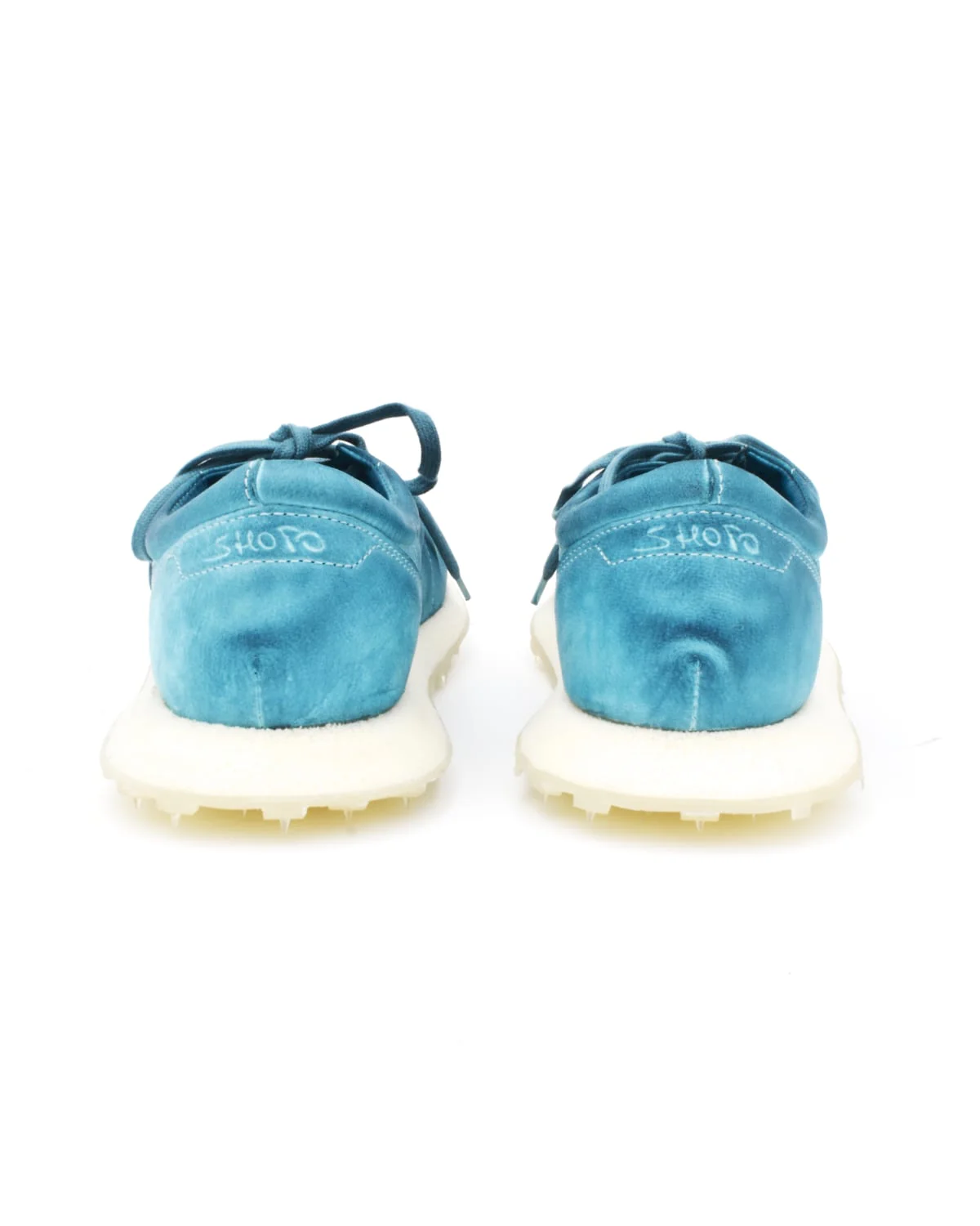 This season Shoto turned the dial up on all the classics. The waffle bottom running shoe has not been lost to retro history. It's back again with a square toe and an extended white sole. The super soft leather uppers have been vat dyed aqua blue after construction so the leather lining, stitching, and laces, all match. Afterwards, they're washed and tumbled for that distressed look. Fits true to size. Handmade in Italy.