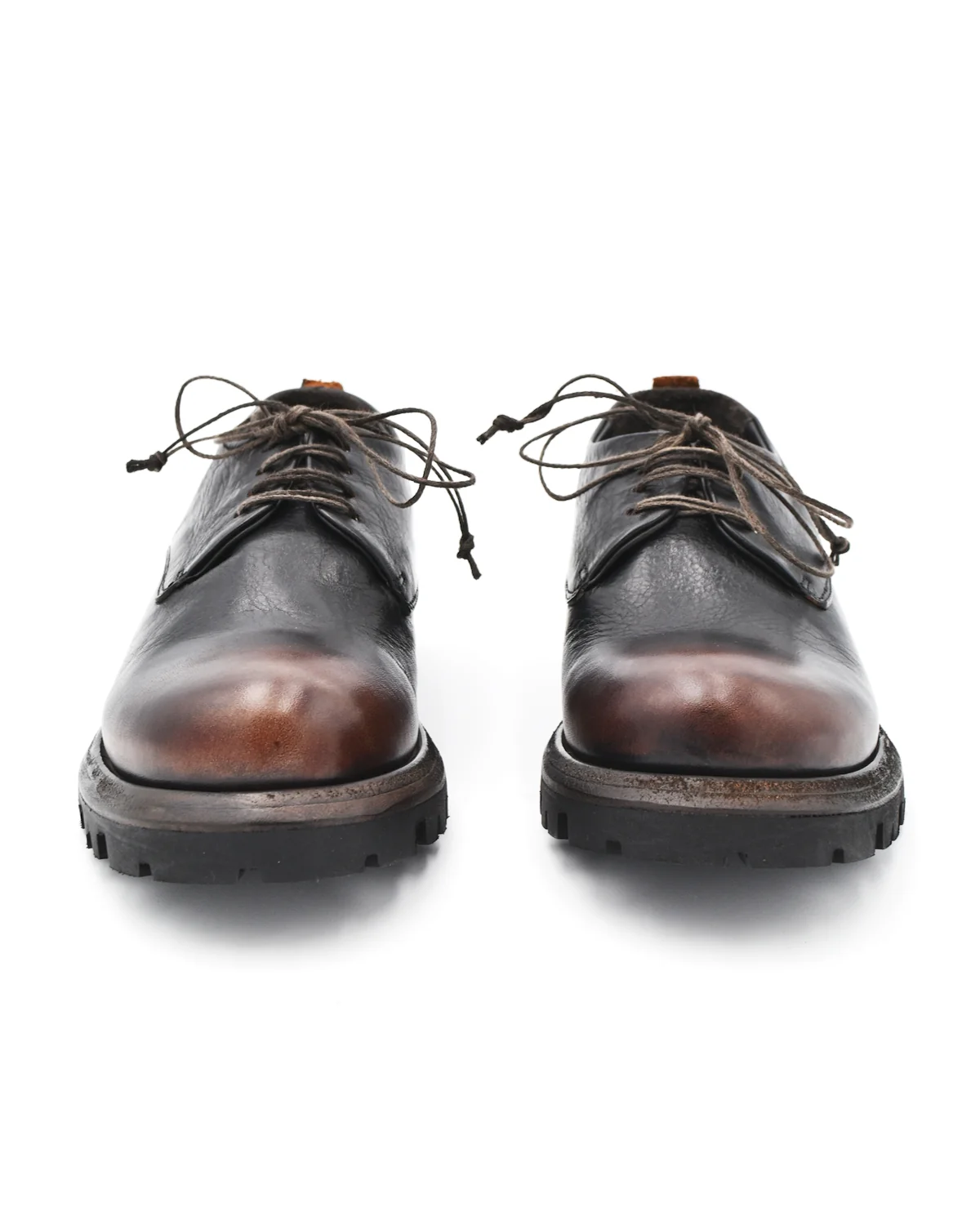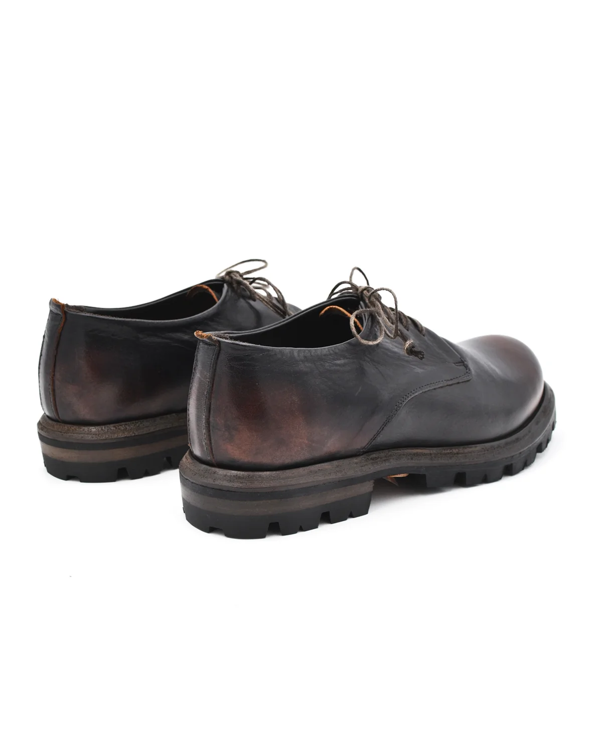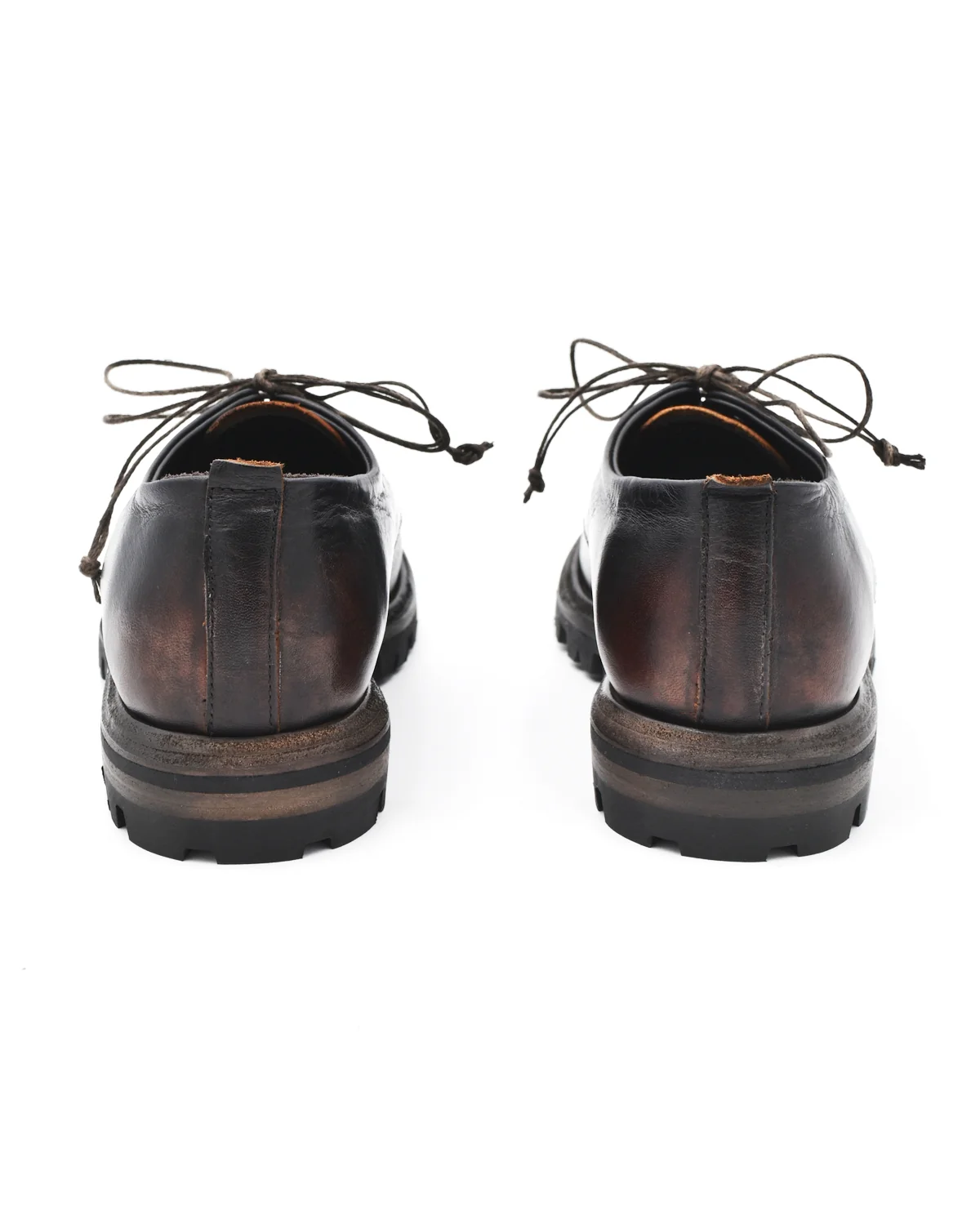 This black oxford by Shoto features a burnished toe cap and heel, twine laces, and lug soles. The shoes have the sophistication of ivy league prep blended with the edge of the English punk scene.