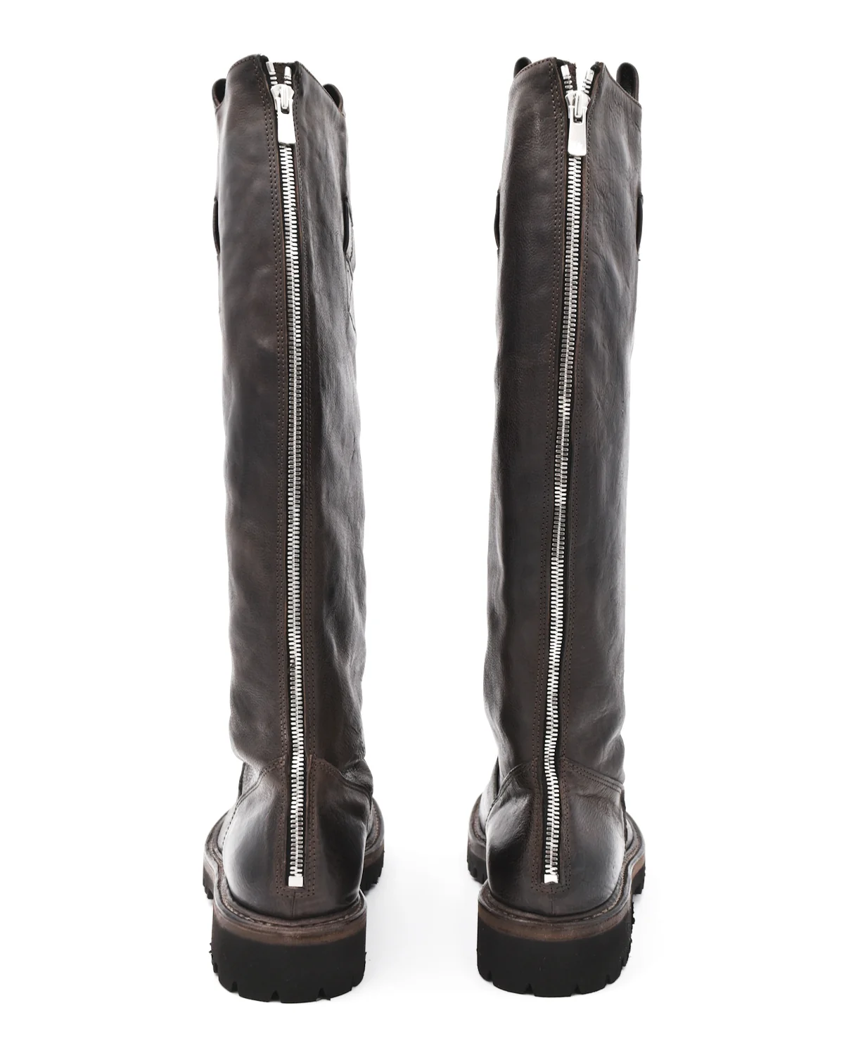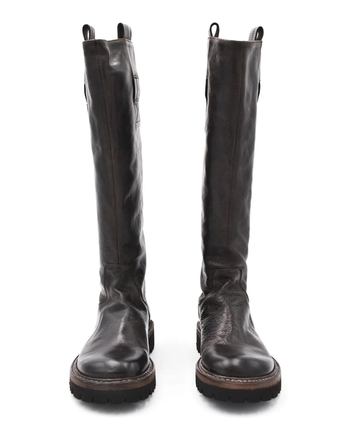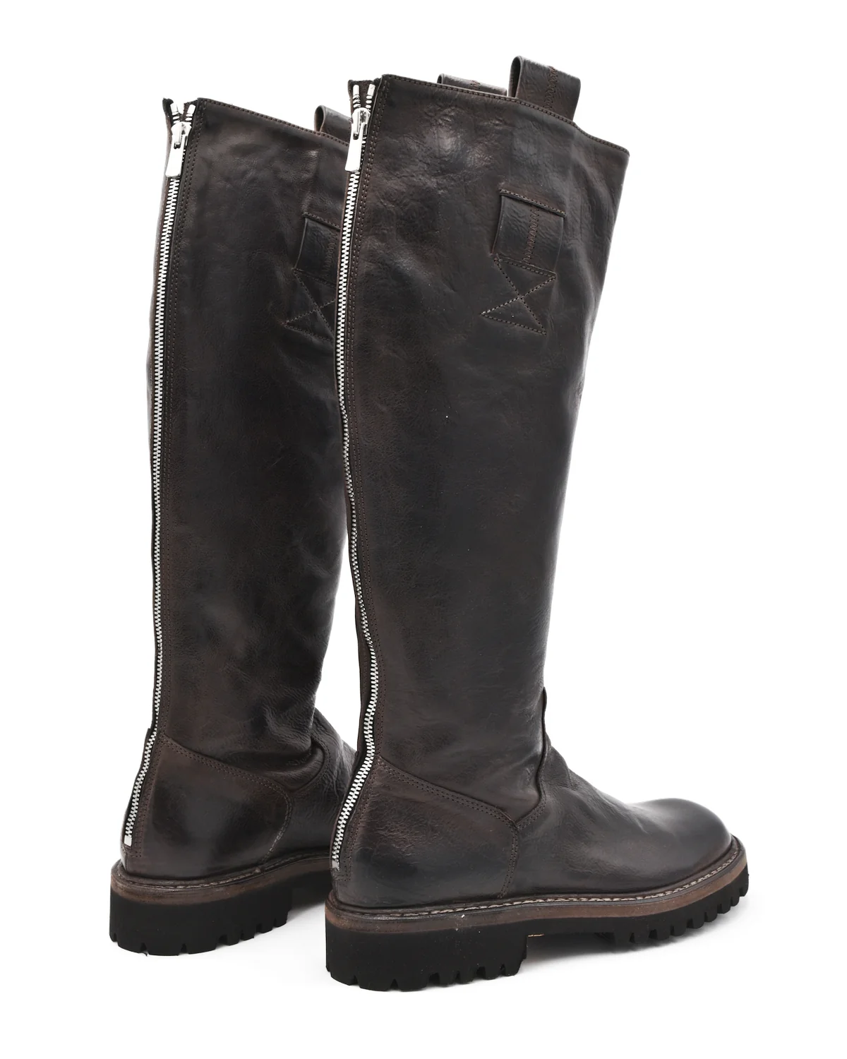 The tall boot from Shoto is a washed brown leather boot with a form cut to the shape of the calf. Features include a Vibram lug sole, a full back zipper, and pull tabs at either side of the top for ideal functionality.