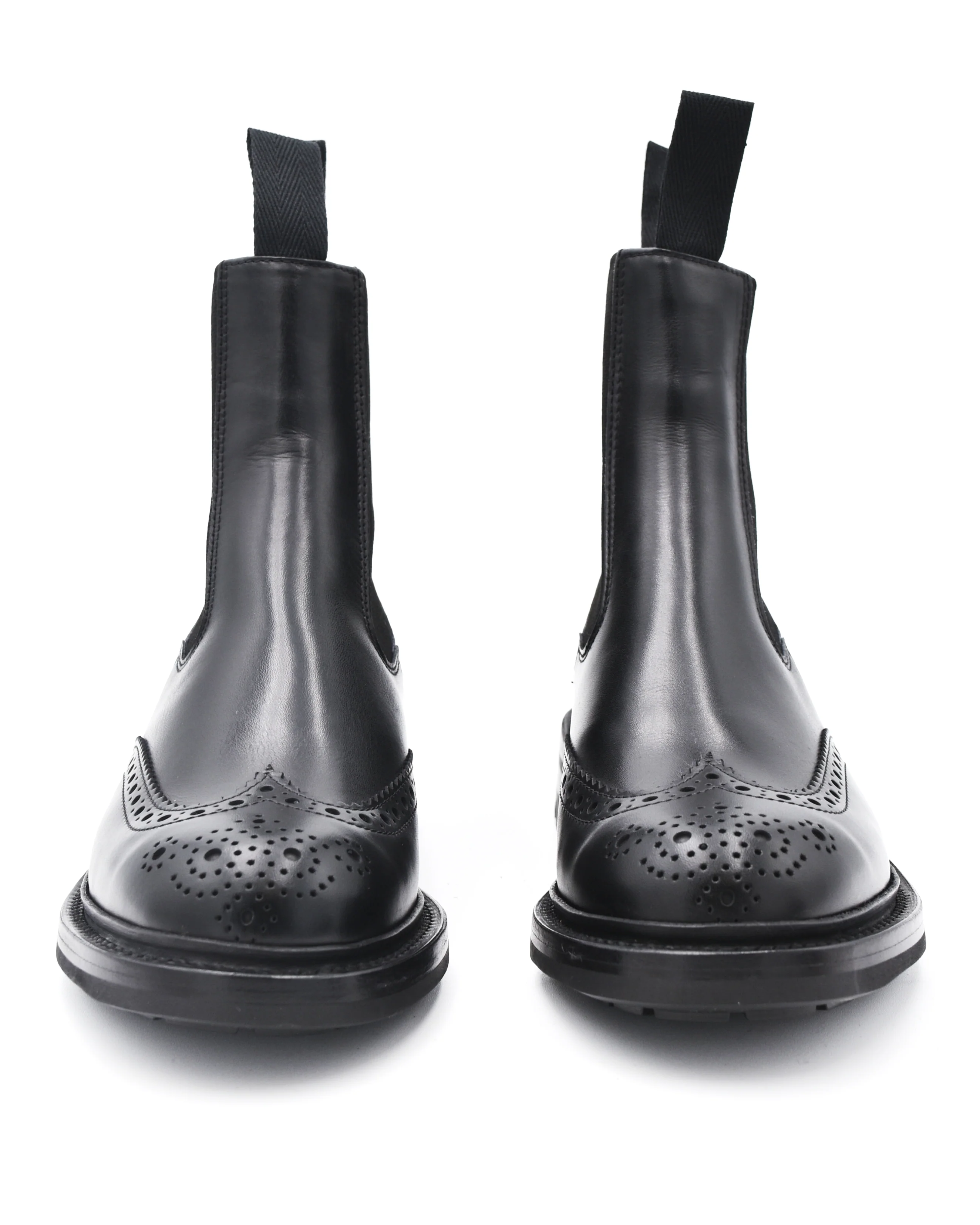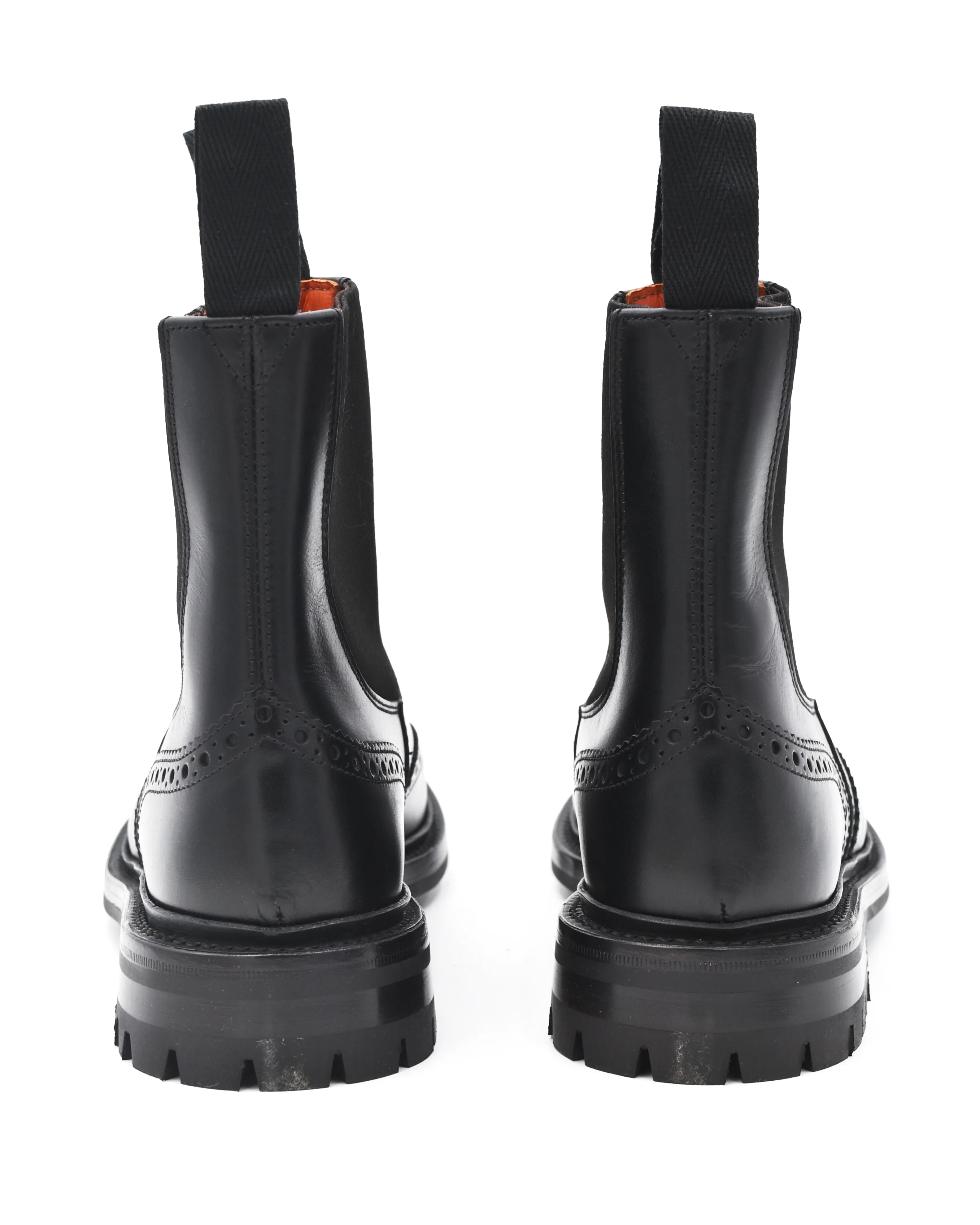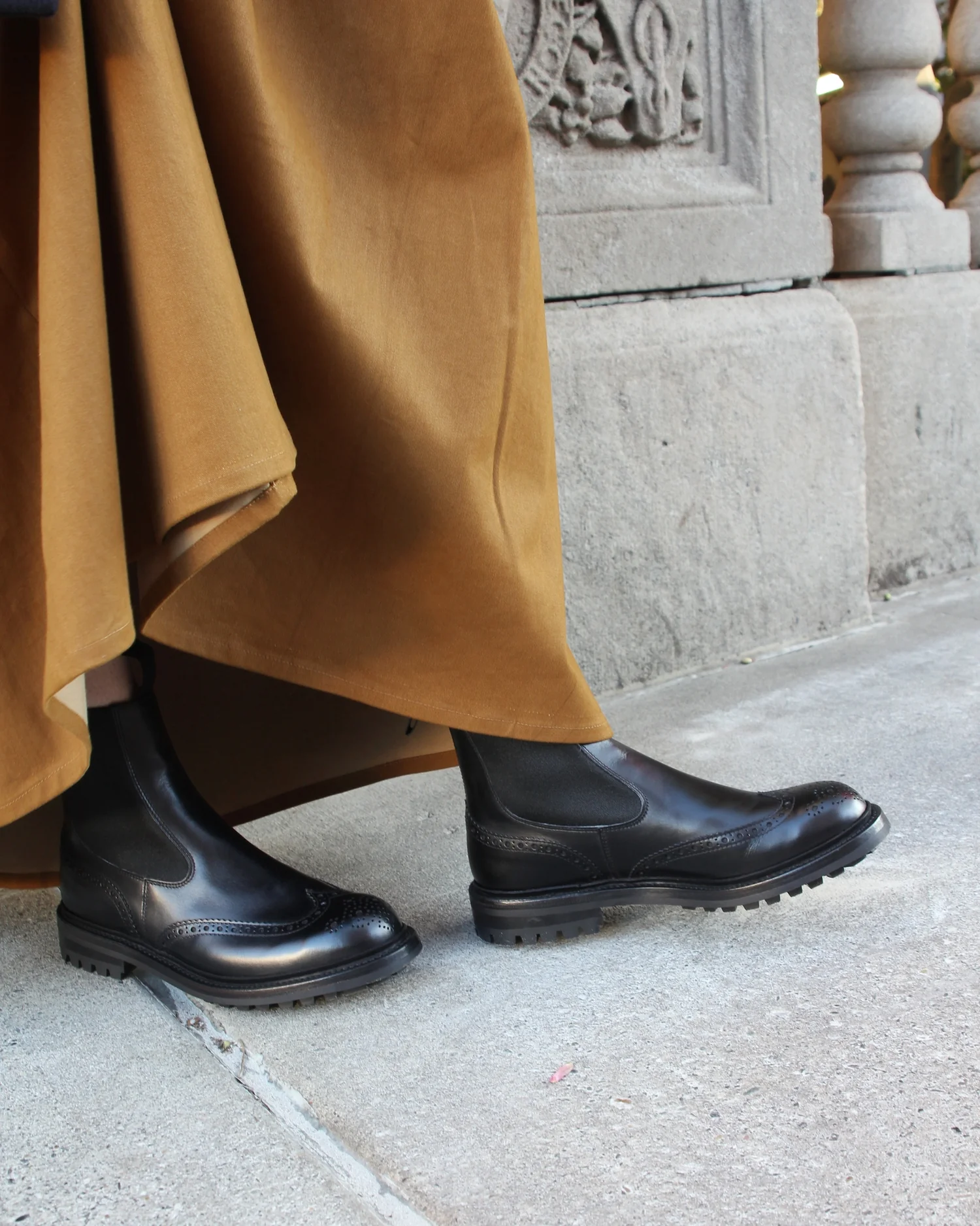 These pull-on boots by Trickers have the stylistic familiarity of a brogue boot with the easy wear of a Chelsea, otherwise known as a dealer boot. The 'Silvia' boot features iconic ‘Tricker’s’ brogue detailing, two elastic side panels and tabs to ensures they easy to get on and off. Built on a storm welt to ensure of a watertight seal between upper and sole.