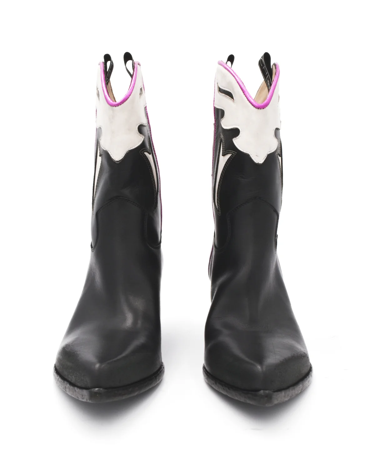 A classic Italian interpretation of the western ankle boot with lots of attitude. Made in soft black and off white leather with western details including inlay on the shaft, low slung undercut stacked heel and western pointy toe. Completing the boot is the pink piping down the center of the shaft and finishing the top. Runs fairly true. Full leather construction. Made in Italy.