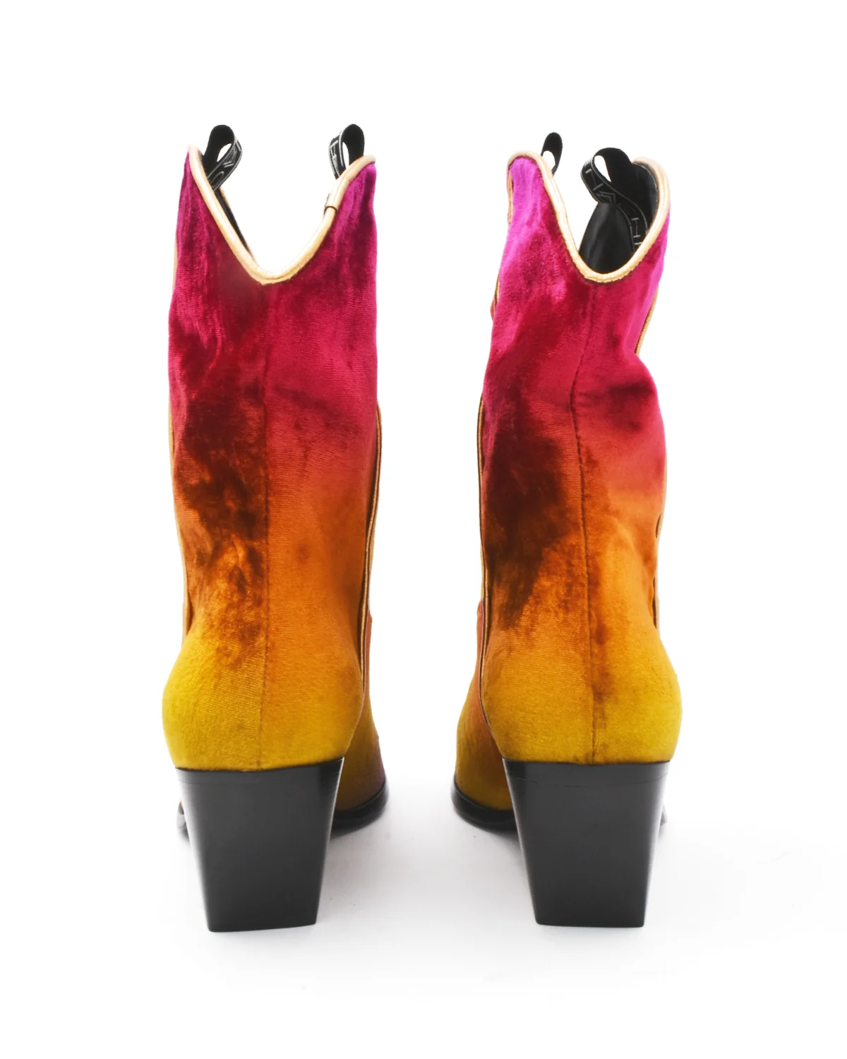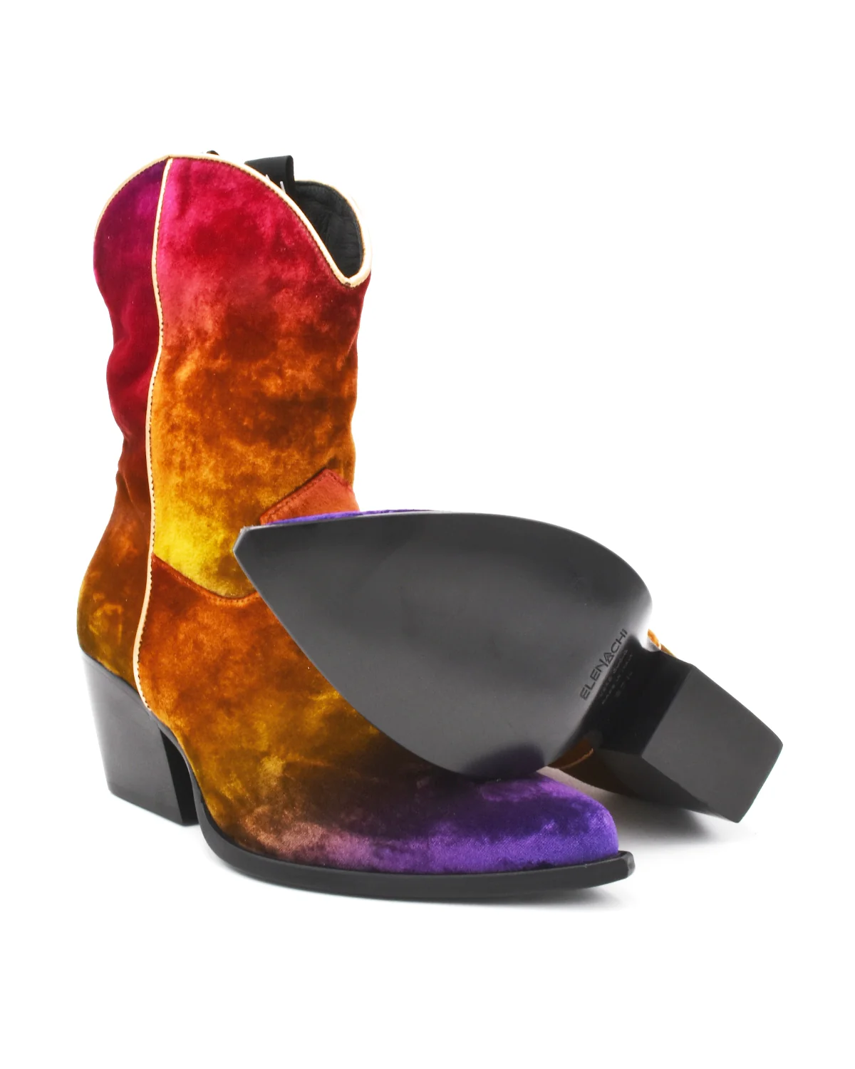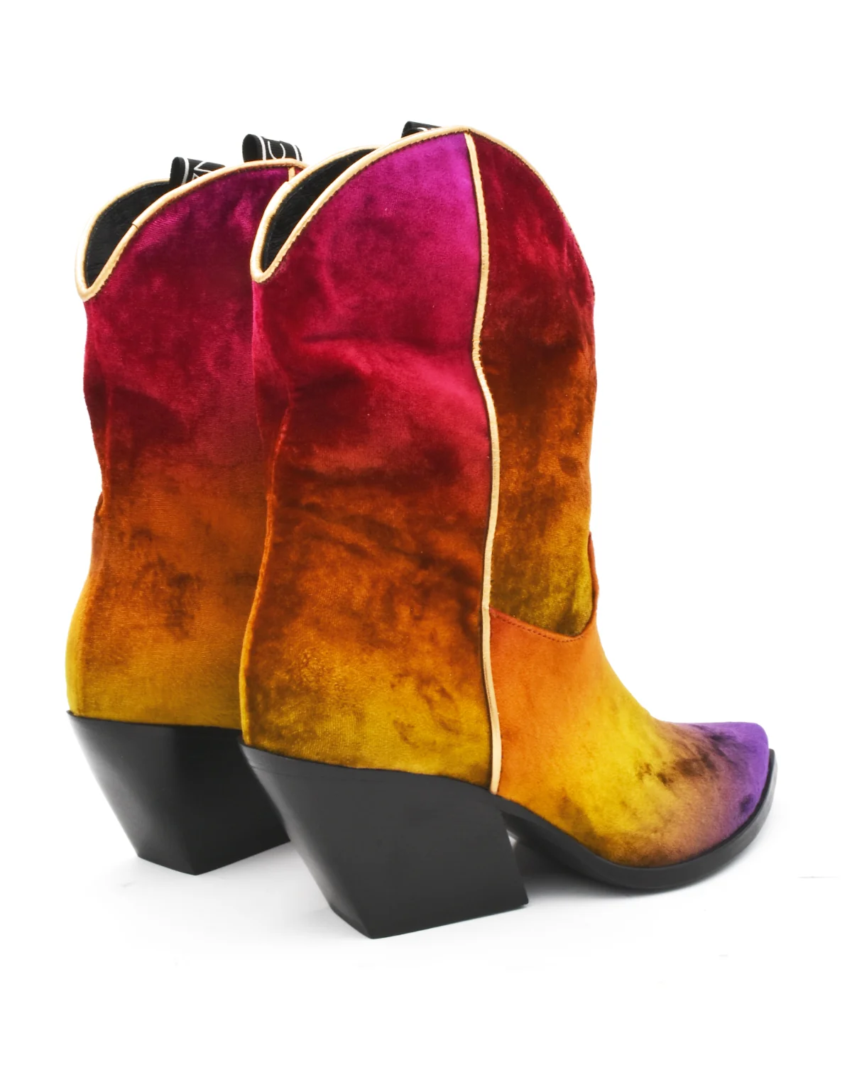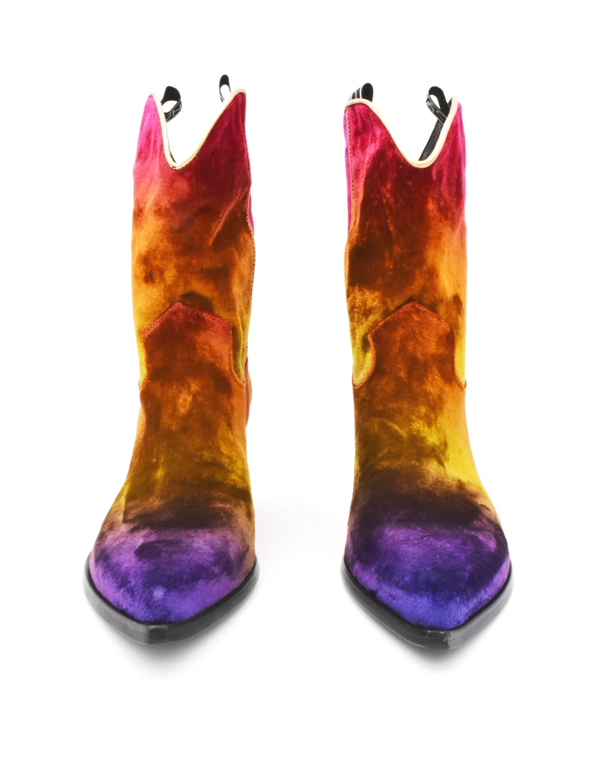 An ethereal interpretation of the western ankle boot. Made of a psychedelic colored velvet (commercial quality) where each boot is dyed and matched to its mate. These boots change color as they move through the light. Truly unique. Other western details include the low slung undercut stacked heel and western pointy toe. Runs fairly true. Lots of attitude. Full leather construction. Made in Italy.
