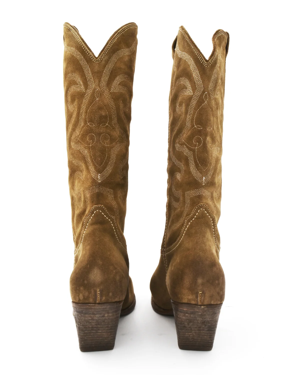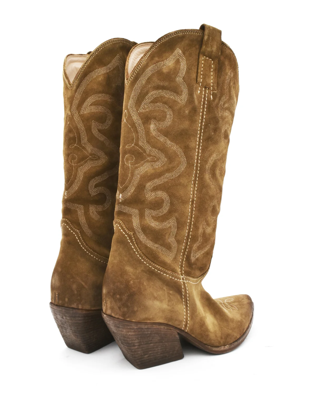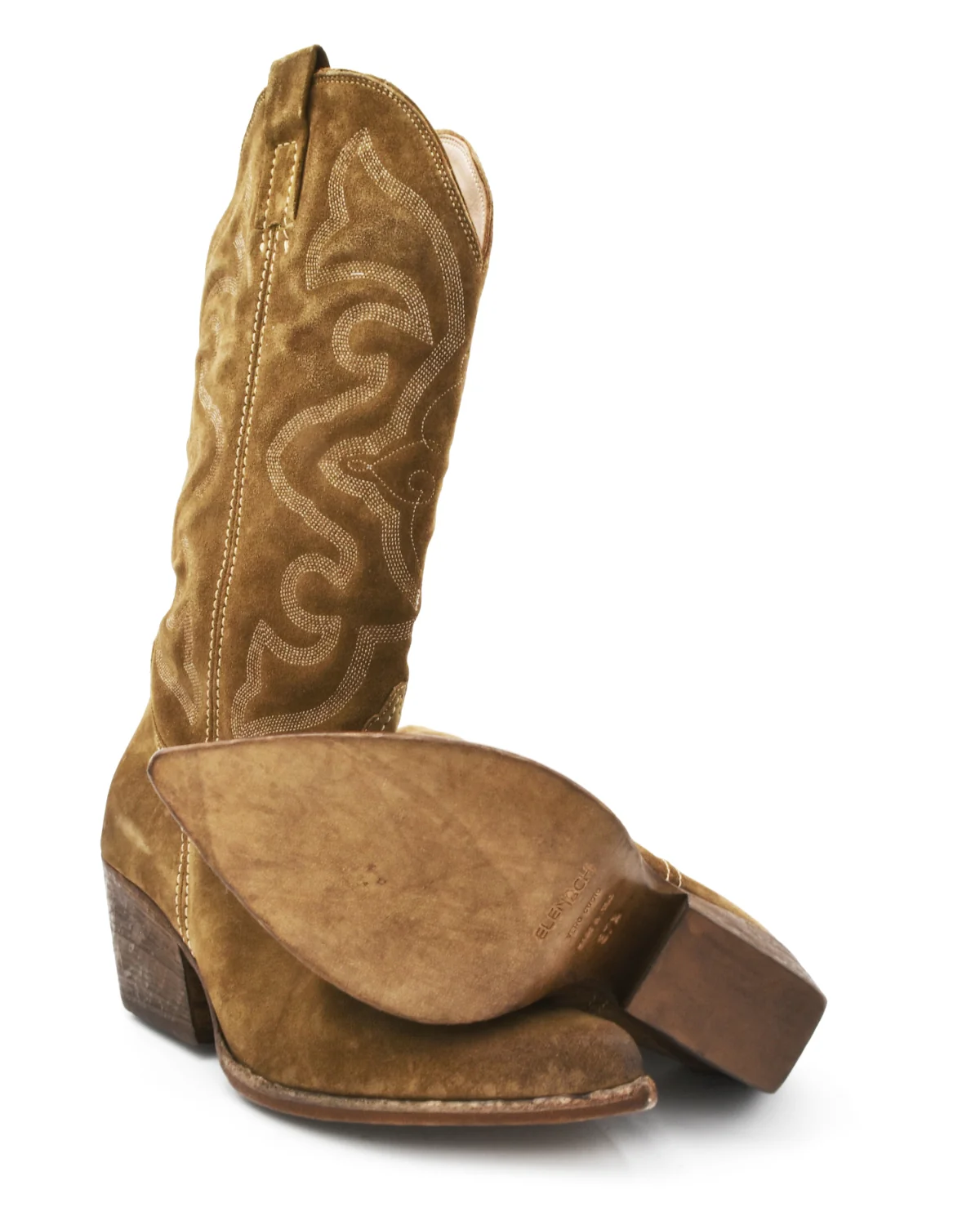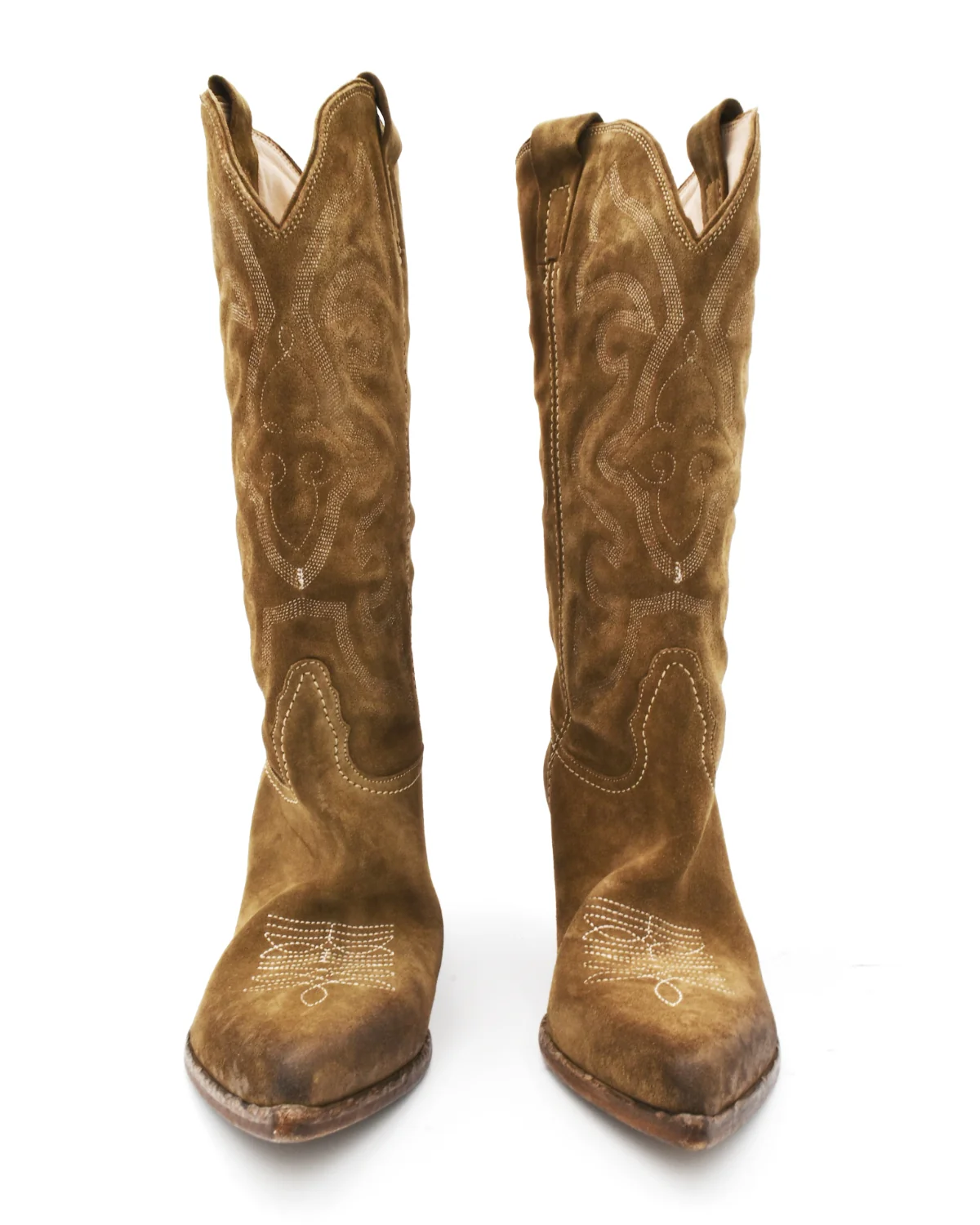 A classic Italian version of the western oven the calf boot. Made in soft brown suede leather. The boots have been washed and tumbled for a more lived and loved look. Other western details include intricate stitch work on the shaft and stitched scrolling on the tow. Other details include low slung undercut stacked heel and a fully lined interior. Runs fairly true. Full leather construction. Made in Italy.