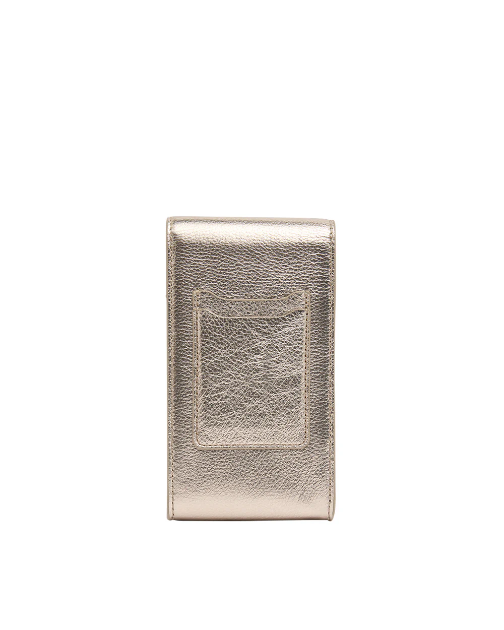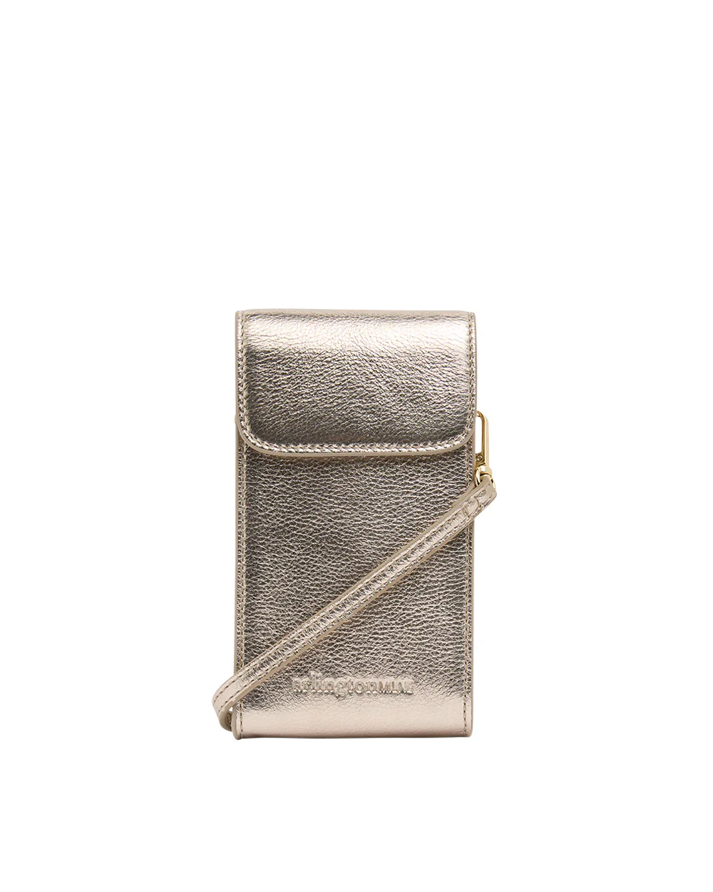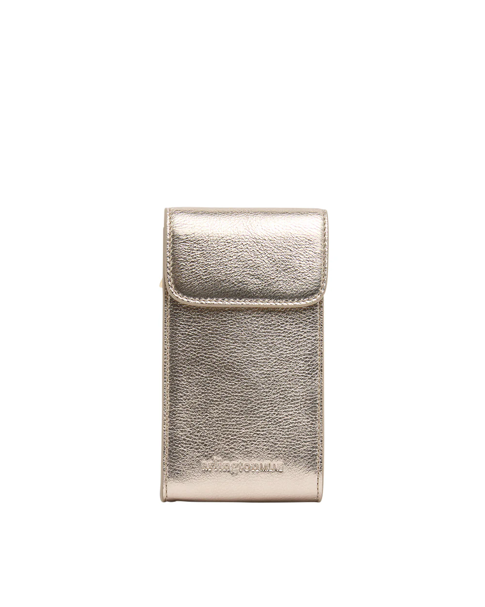 The Arlington Milne Celeste Phone Bag is crafted from premium leather. The bag features light gold hardware, a leather crossbody strap and short chain wrist strap. The bonded leather top flap is secured with a hidden mag closure and opens to reveal light toned leather lining. The Celeste features two rear mounted card slots