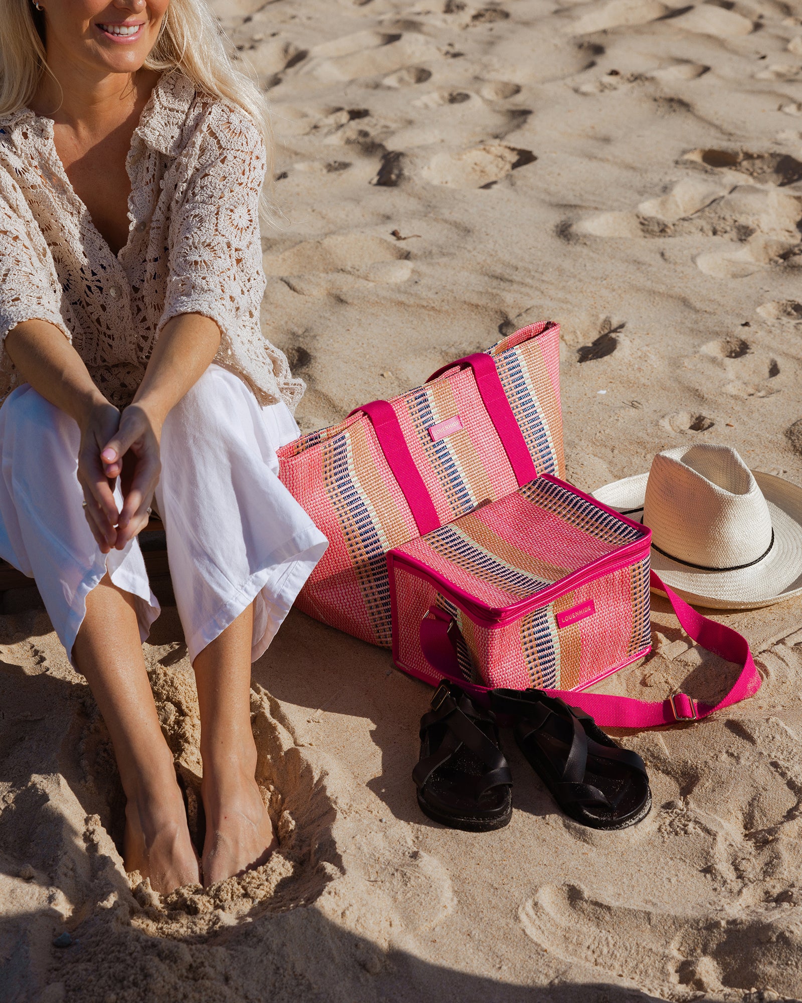 The Louenhide Dina Pink Navy Jute Lunch Cooler is your ticket to a relaxed beachfront picnic. Whether you're strolling along the shoreline or finding the perfect spot in the sand, this stylish and practical lunch bag effortlessly goes wherever you go. Carry with ease and simply swing the adjustable and comfortable webbing guitar strap over your shoulder. Elevate your beach days with the vibrant and textured woven exterior, ensuring that your setup is as eye-catching as it is functional. Take your picnic adventure to the next level and enjoy chilled beverages, fresh sandwiches or summer fruits, knowing the internal foil lining is keeping everything cool. Enjoy your memorable moments and keep your refreshments cool with the Dina Pink Navy Lunch Cooler, your summer necessity.