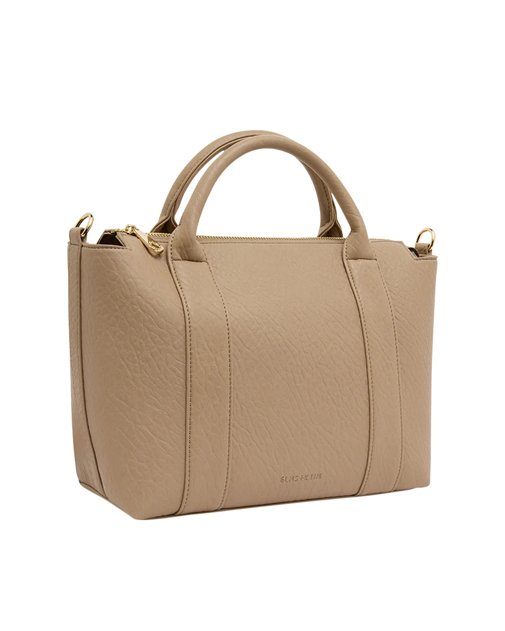 The Elms + King Messina Tote is made from premium recycled PU and features classic structured body construction and top grip handles. The Messina can be carried using the handles or worn using the removable crossbody strap. The bag features a top zipper, which opens to reveal an ample centre compartment with a PU trimmed zipper pocket, and PU trimmed open top slip pocket.